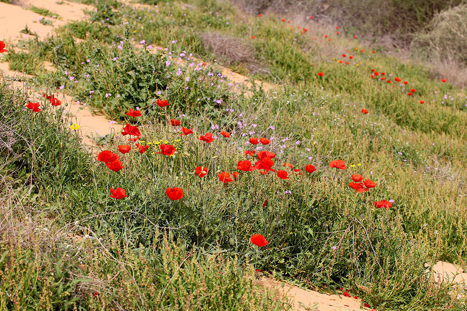 И буквально за холмом перед нами открылась сногсшибательный вид: песок и маки.