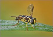 Владимир Давыдов: Xanthogramma pedisequum. От X. citrofasciatum отличается широкими пятнами на втором тергите (первый из видимых) и бурыми вершинами задних бедер и бурыми задними лапками.
