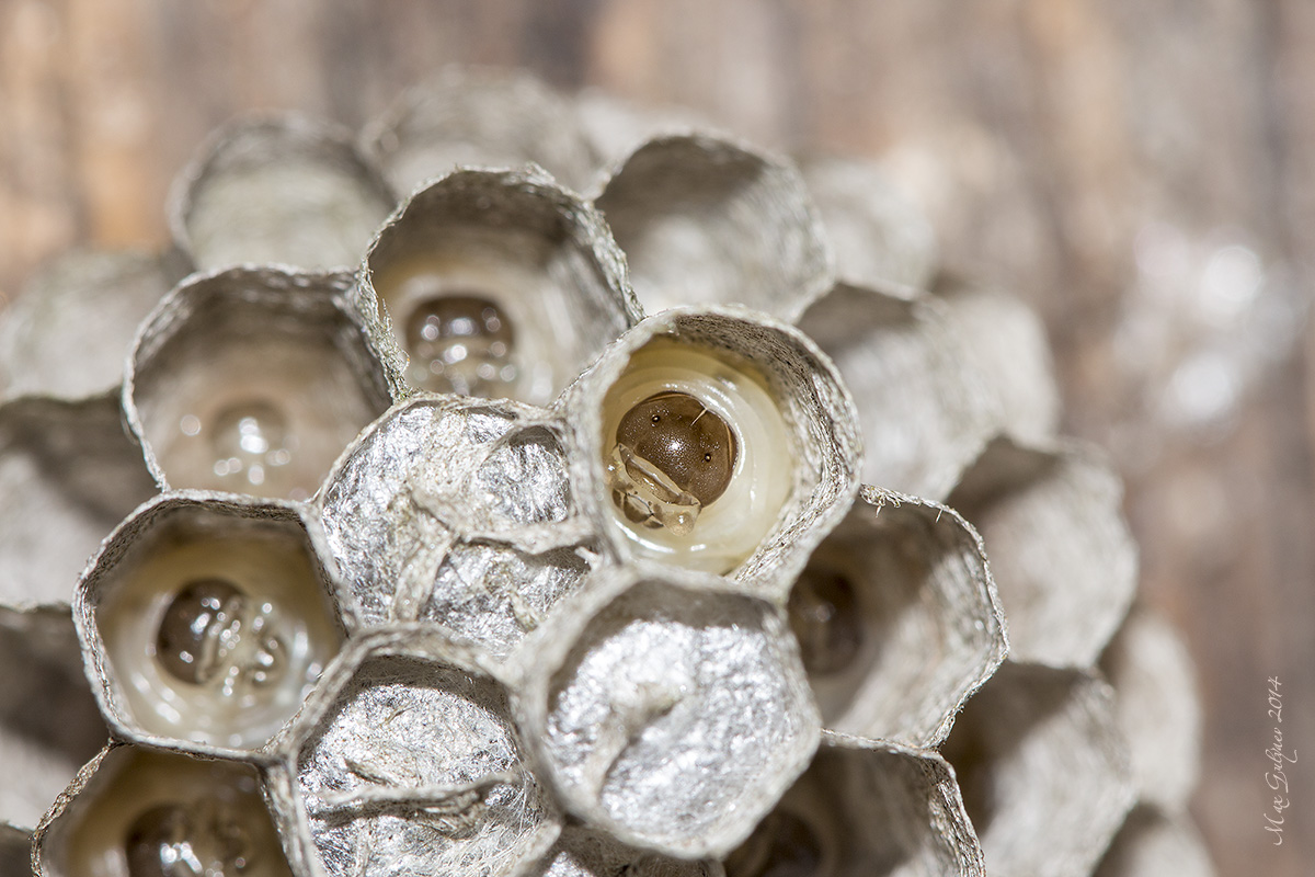 Разбирая старые стройматериалы, поднял старую гнилую доску. На нижней её стороне оказалась прикреплена пара небольших гнёзд бумажных ос. Таким образом, мне первый раз представился случай заглянуть в это интересное сооружение изнутри и поснимать...
