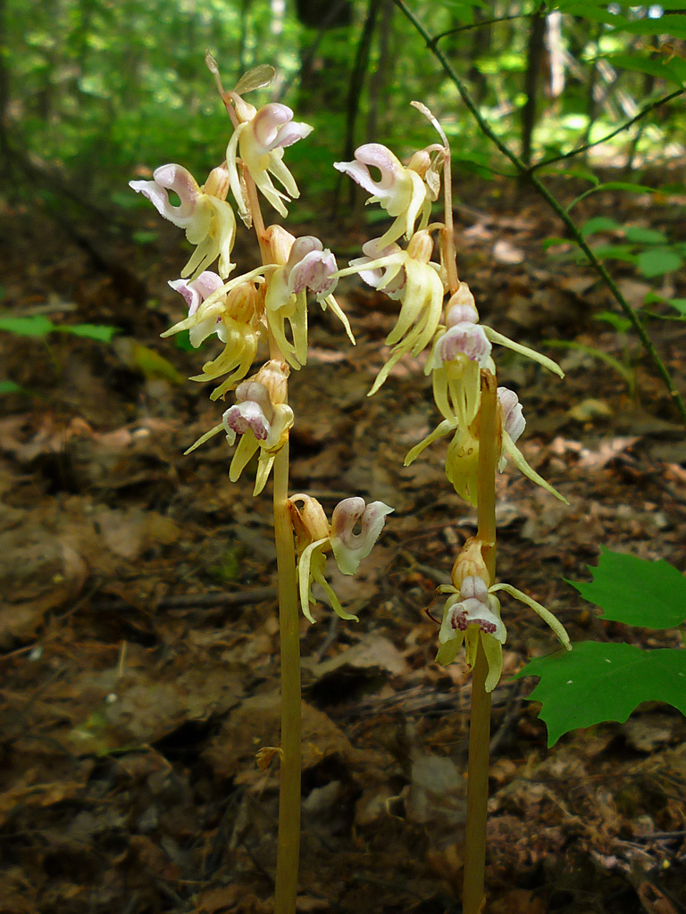 Орхидея. Сапрофит, питание осуществляется с помощью почвенных грибов-симбионтов. Растет в тенистых, сыроватых, обычно мшистых, чаще хвойных, смешанных или лиственных лесах, иногда на облесенных ключевых лесных болотцах. Обычно развивается на мощной рыхлой, богатой гумусом лесной под стилке, изредка отмечается в сухих мертвопокровных лесах.