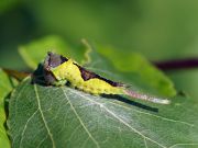 На переднем плане взрослая личинка листоеда ольхового, а на заднем плане личинка пенницы ольховой...