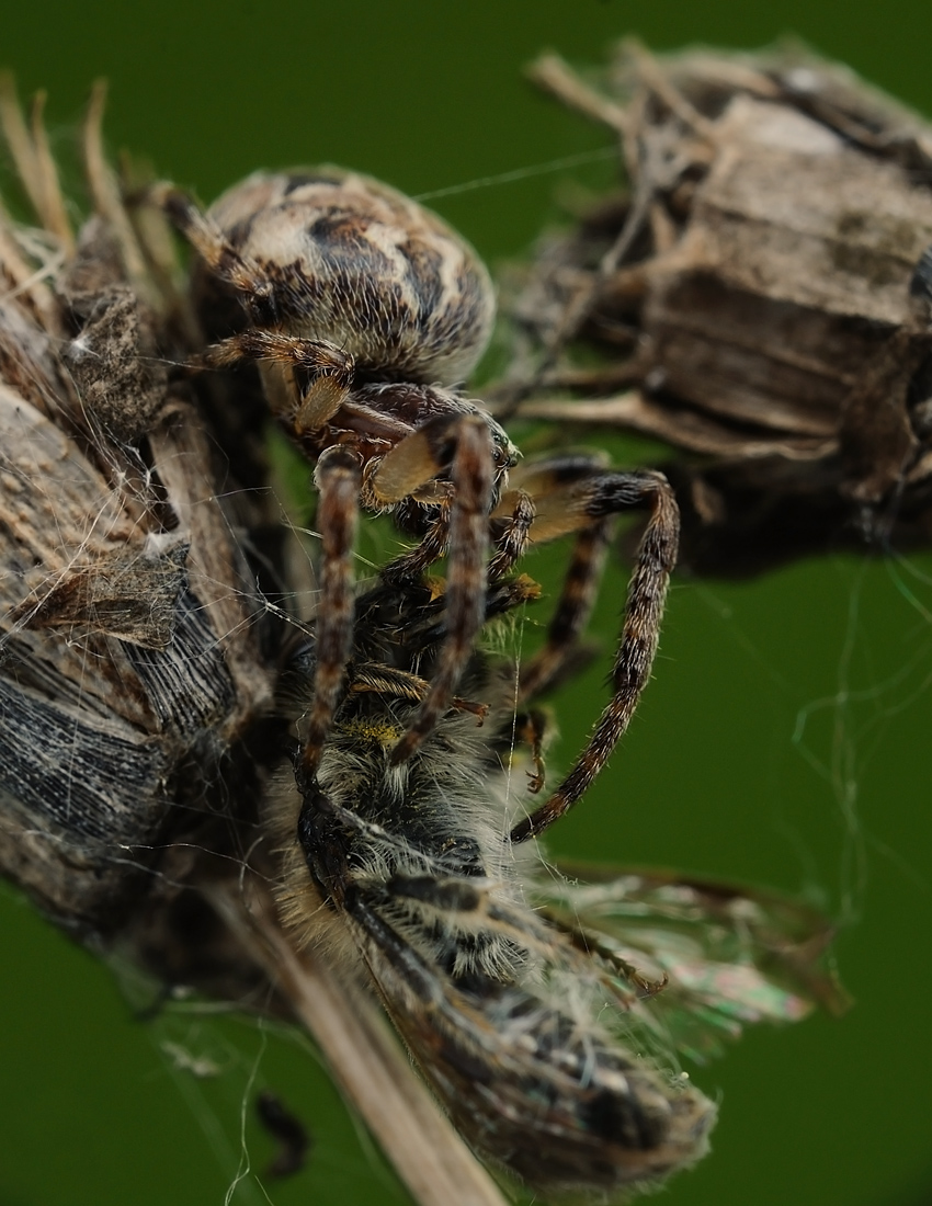 Паучиха была довольно спокойной, поэтому смог в полевых условиях протестировать супермакро, жаль ничего толкового не получилось. Хотелось снять крупным планом клыки входящие в жертву)