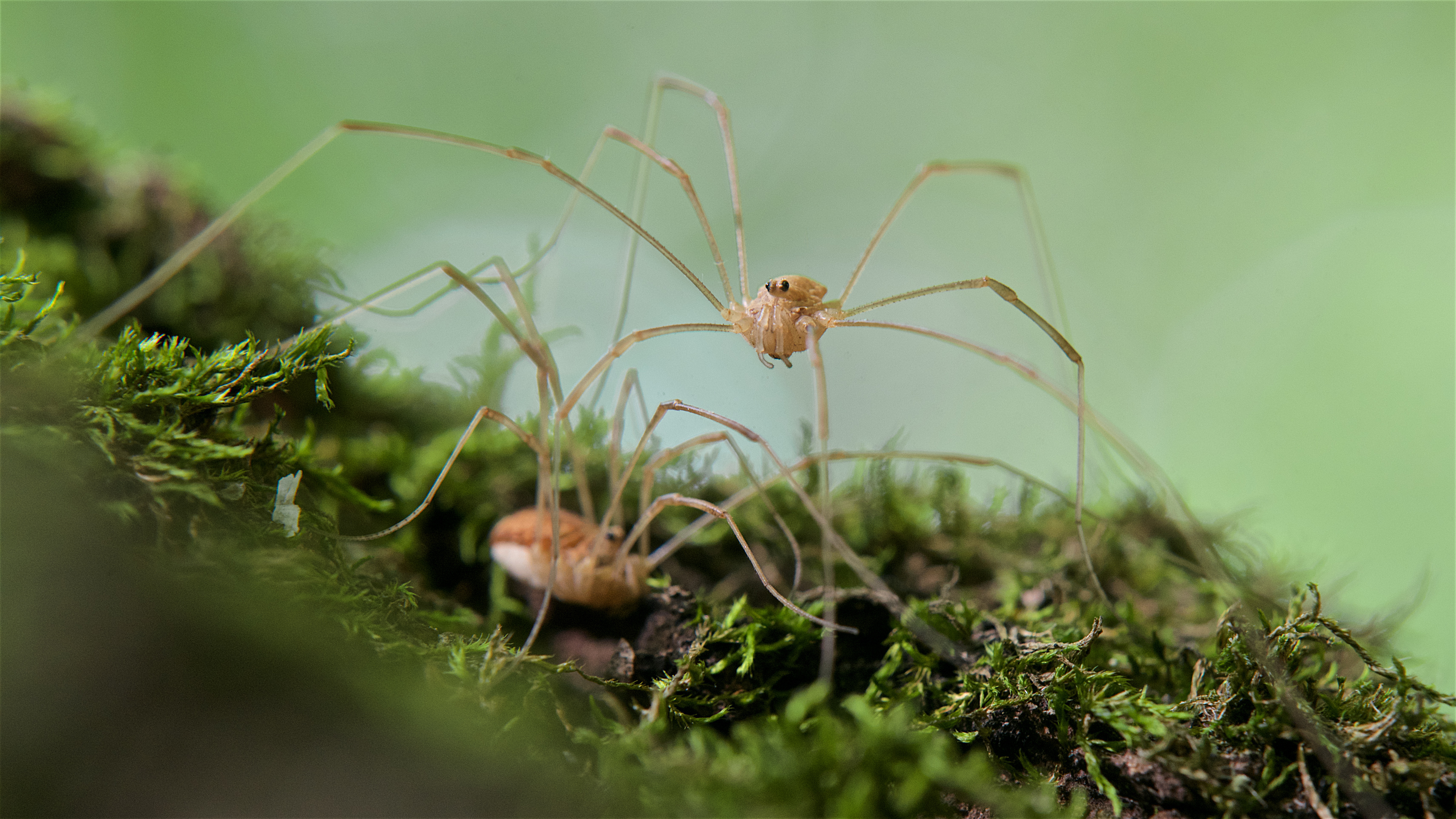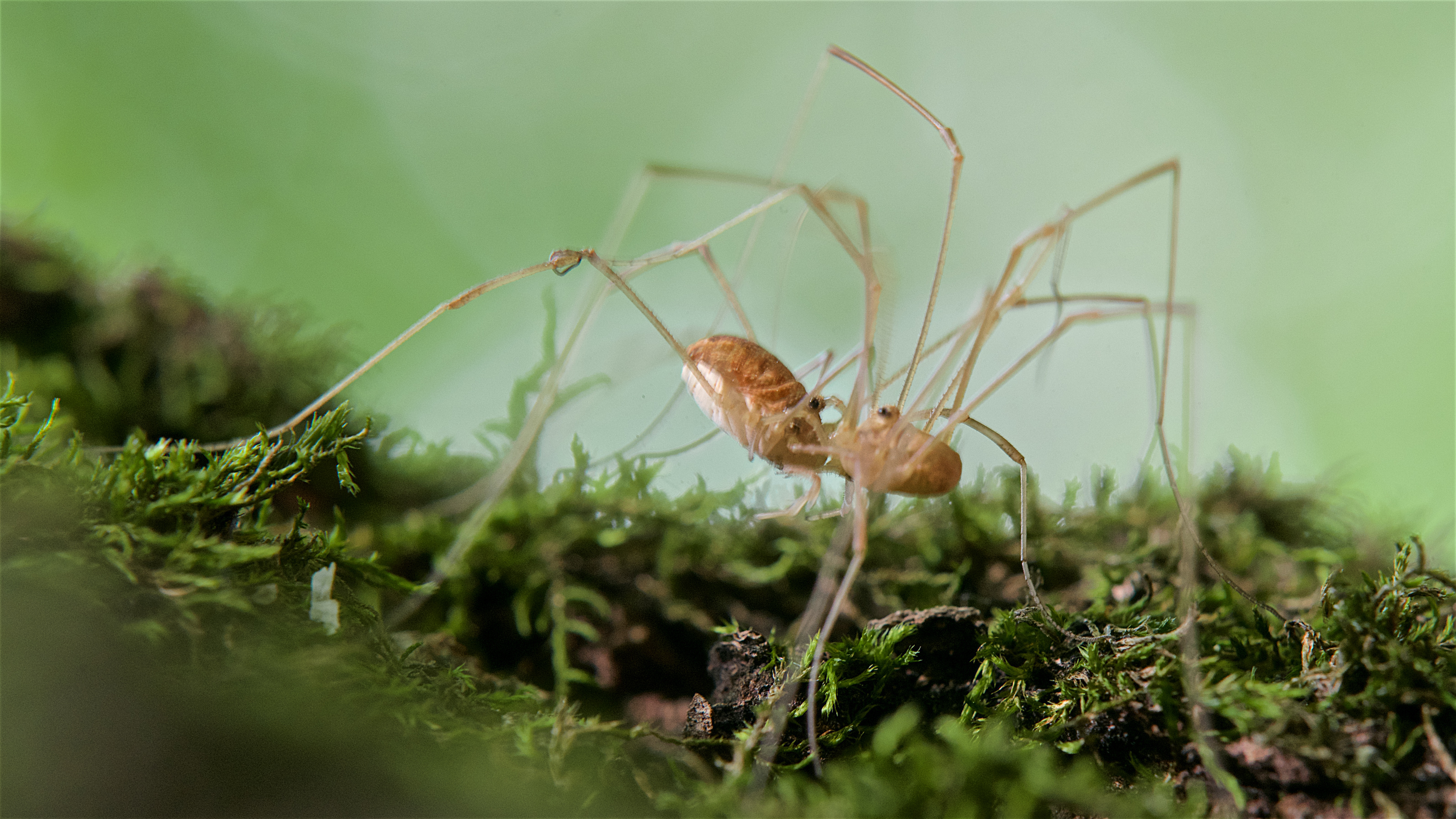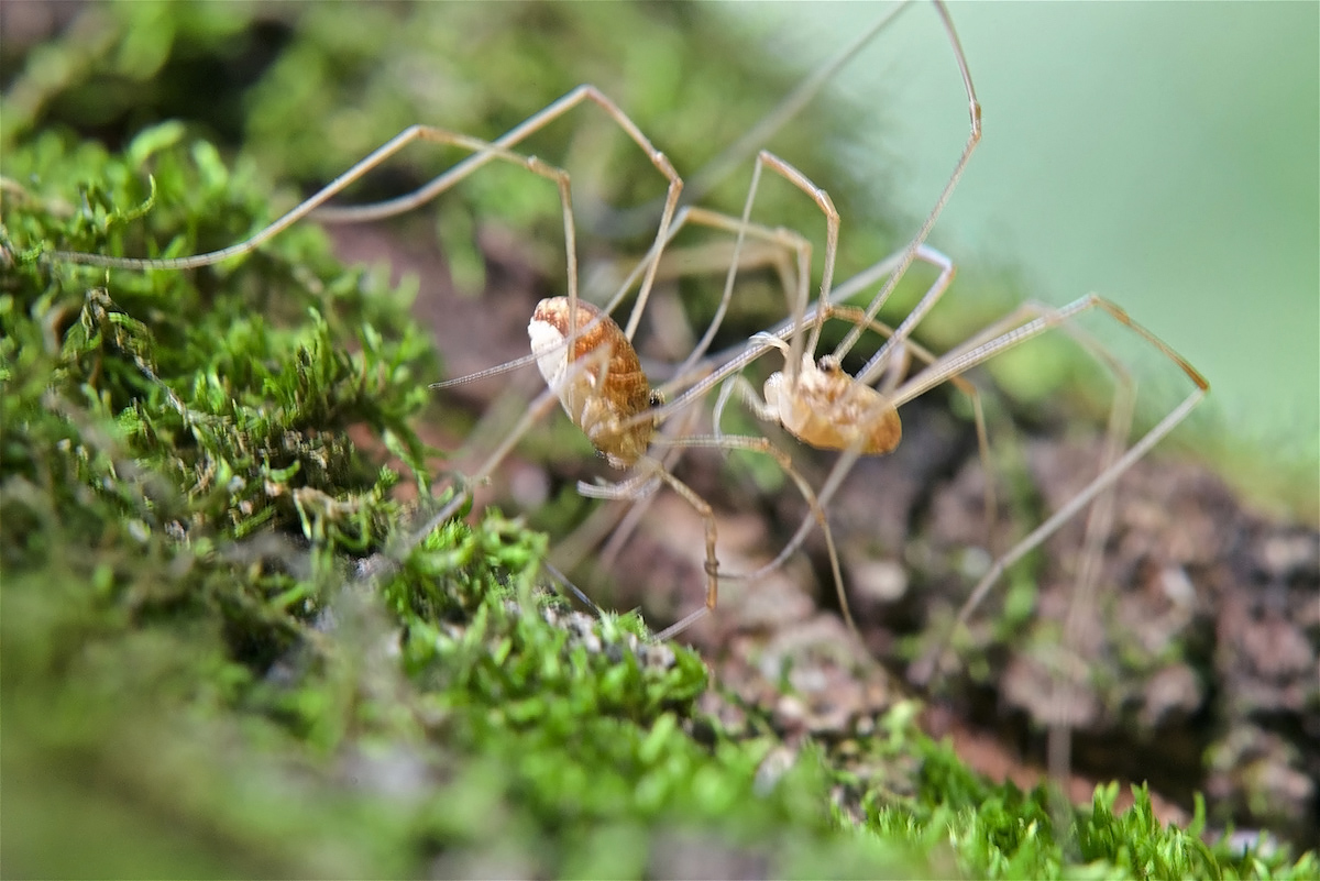 Должен признаться, что "сказка" вышла рукотворная Обнаружил двух сенокосцев на стволе дерева и по очереди выгнал их веточкой на освещенную часть, там один сначала затаился, но когда приблизился другой его собрат, резко подскочил и между ними произошло что то вроде скоротечной схватки бойцов-единоборцев, стиль определить трудно, судя по мельканию многочисленных лап, наверное капоэйра