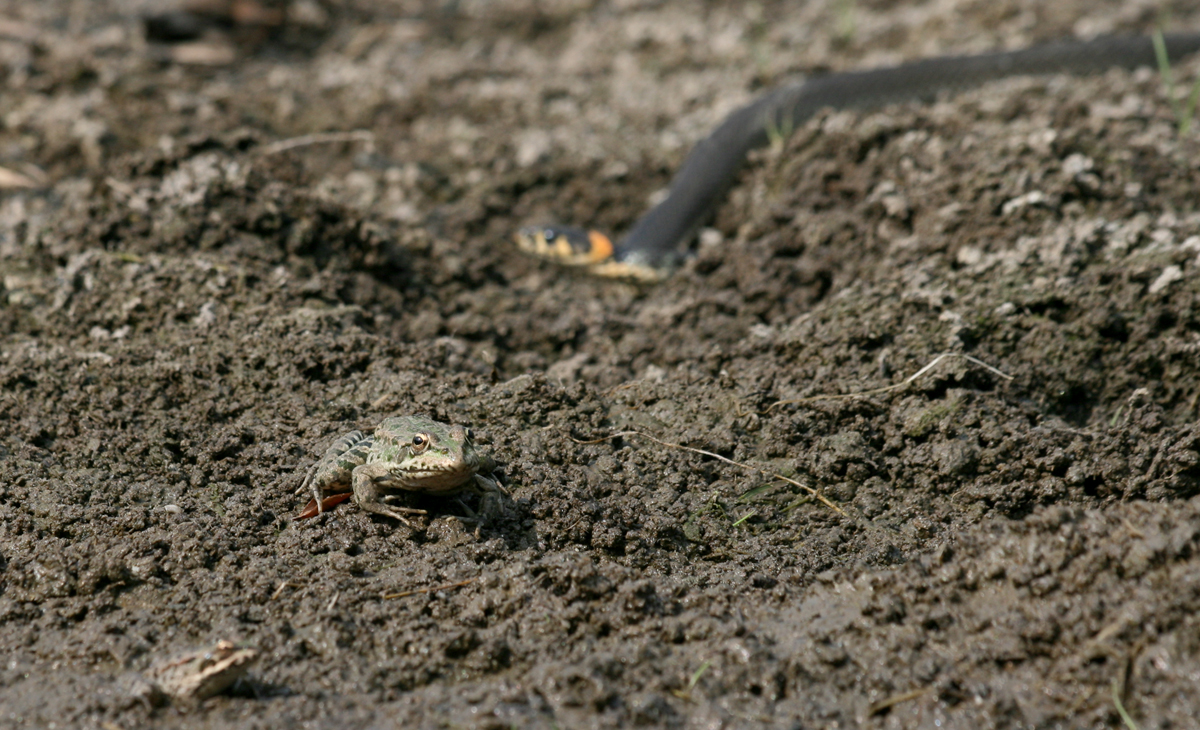 Обычно лягушки становятся жертвами ужей. Но новорожденные ужата настолько малы, что ими легко лакомятся крупные лягушки. Решил "инвертировать" традиционный сюжет с резким лягушонком и наползающим из тумана ужом: маленькие змейки не менее беззащитны, чем лягушата.