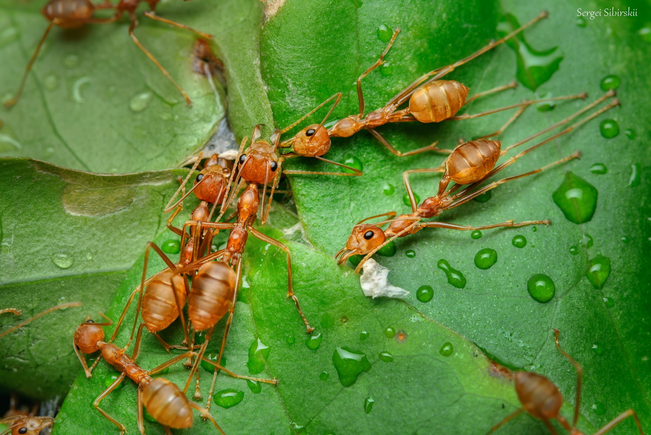 Пишут, что в Древнем Китае садоводы переносили гнезда муравьев-портных в свои сады. Они знали, что если на дереве есть гнездо портных, то этому дереву не страшны никакие враги. В современном Китае работники отеля попытались уничтожить это гнездо. Они заметили, что я лазаю в кустах и пыхаю вспышкой. Подошли, посмотрели, поулыбались, показали большой палец и ушли. На следующий день я, к своему ужасу, обнаружил, что гнездо чем-то залито, листья скукожились, а живых муравьев практически нет... Но упрямые трудяги просто так не сдаются: через два дня, перед отлетом, обнаружил, к своему удовольствию, что гнездо потихоньку начинает восстанавливаться и внутри куста зеленые листья вновь сшиваются оранжевыми живыми нитями, образуя пока еще маленький шарик...