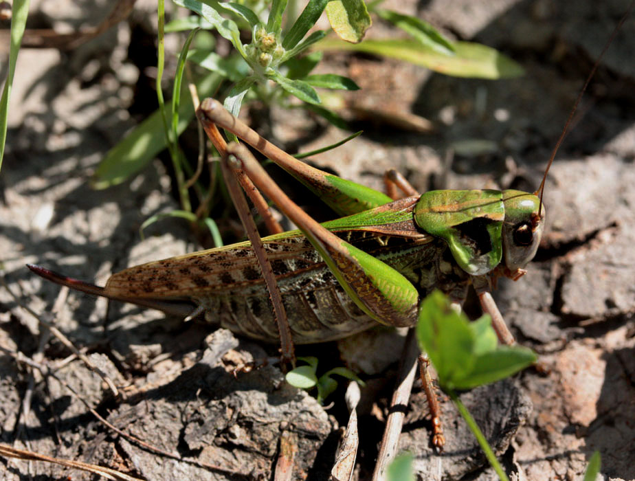 Но вот эта самочка больше оправдывает название – пестрый кузнечик. И крылья, и брюшко у нее густо усажены темными пестринами, да и бедра потемнее. Темное пятно по бокам груди резко отличает ее от предыдущих дектикусов. Да и яйцеклад у этой самки будет поострее, чем у зелененькой самки. Думается, что это совсем другой подвид, может быть и вид, ибо на территории России числится два вида дектикусов. Толстое брюшко самки набито яйцами и она, по-видимому, вот-вот начнет откладывать яйца в глинистый грунт дамбы.