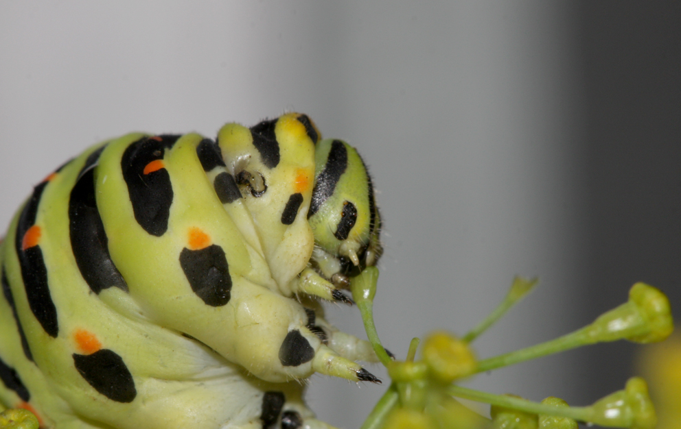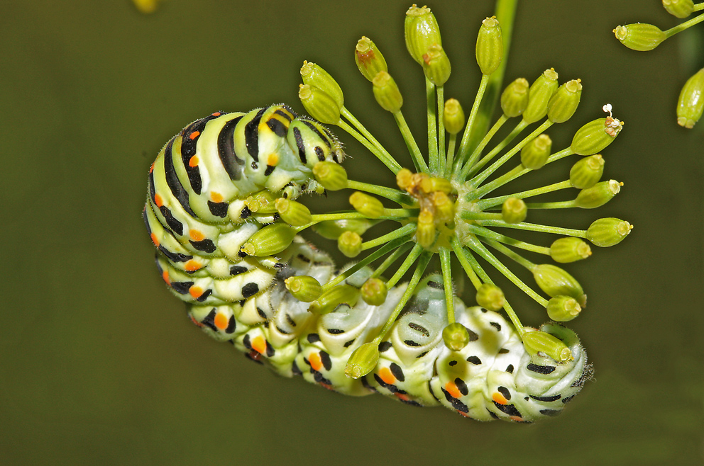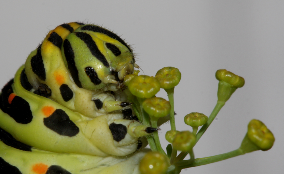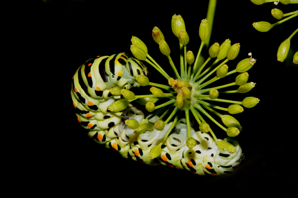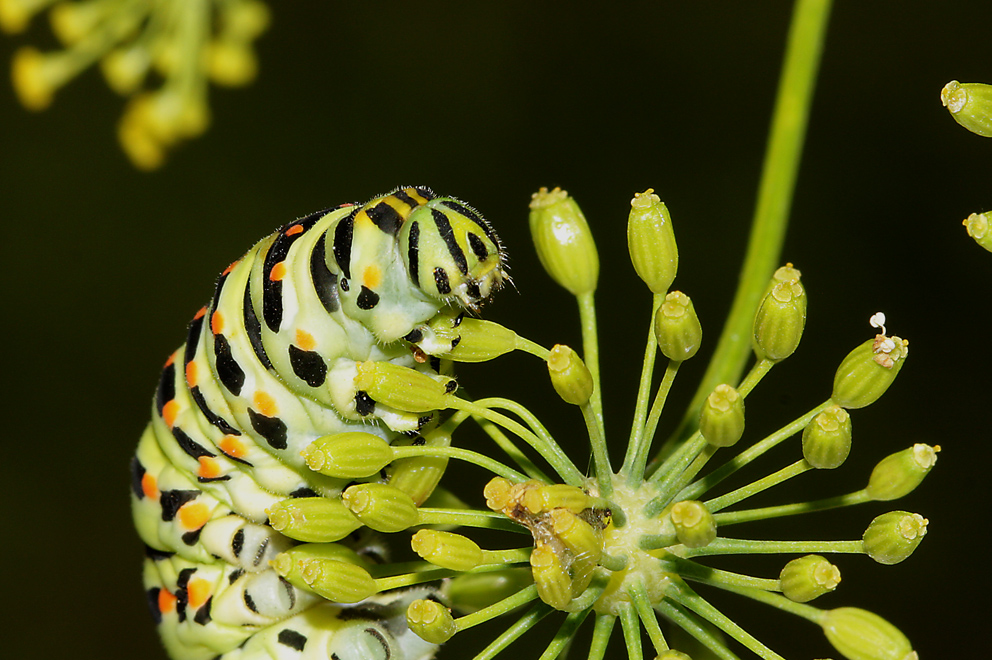Несмотря на яркую окраску, гусеницы махаонов не всегда сразу бросаются в глаза. Объедают наиболее питательные части укропа - бутоны,позднее незрелые семена. Bon appetit, толстячок.