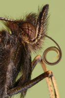 Осваиваю макролинзу Raynox-250, приобретённую у одноклубника baton4eg. Спасибо ему большое! На снимке - голова только что народившегося дневного павлиньего глаза. Снято со вспышкой, разумеется. Почему кверх ногами? Потому что так и висел.