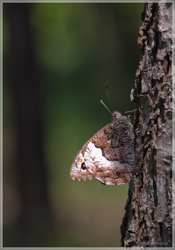 Эти бабочки ( Бархатница бухарниковая, Сатир Гермиона = Hipparchia fagi (hermione)) садятся на стволы сосен и сидят очень чутко. Подойти к ним можно, но фотовспышка вспугивает их еще до конца срабатывания затвора!