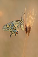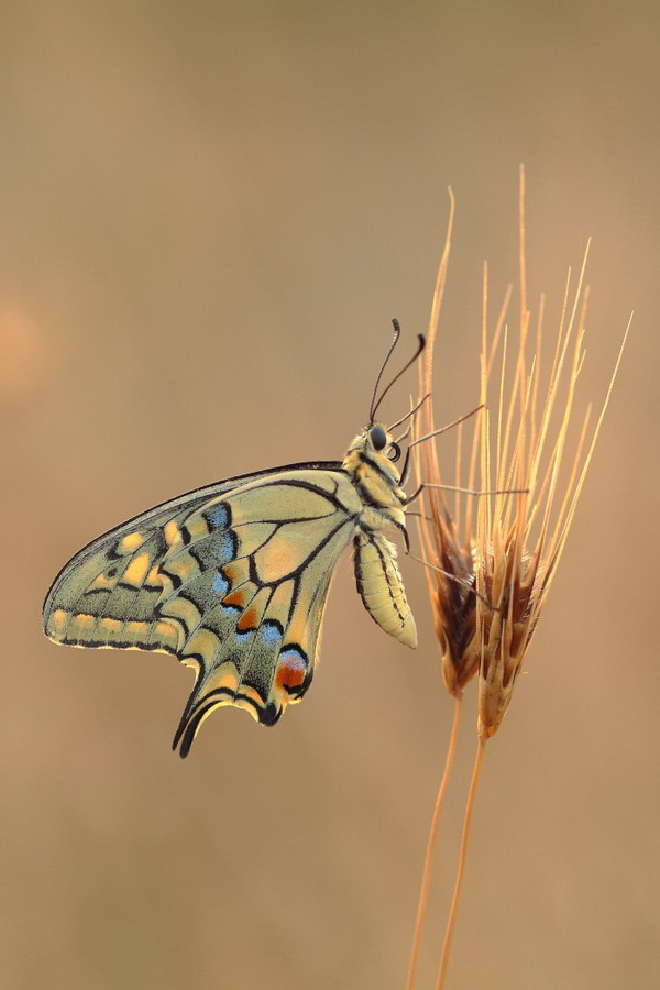 Из этой серии фото в свое время выкладывал, но в другом ракурсе и тональности. В этом кадре удачно сквозь облака отдельные солнечные лучи заходящего легли на крылья бабочки и на верх колосьев