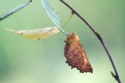 Это гусеница какой-то капюшонницы (Cucullia sp.), сем. Совки ((Noctuidae). Растение, на котором сидела гусеница, случаем, не знаете? С подобной окраской есть гусеницы у нескольких видов капюшонниц. Знание вида коромового растения может помочь определению, т.к многие капюшонницы - облигатные фитофаги (кушают один вид или род растений).
