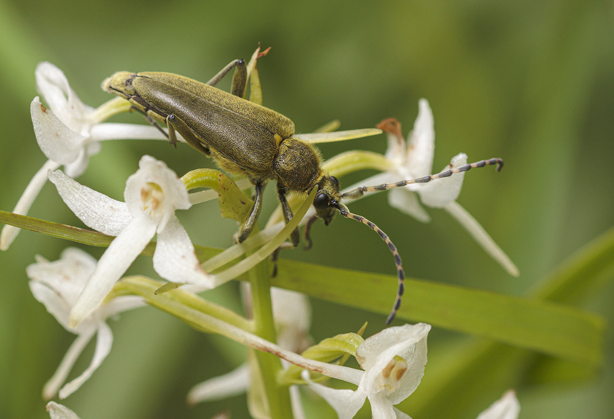 А в этот раз на соцветии этой утонченной орхидеи встретился тяжеловесный усач - лептура зелёная (Lepturobosca virens).