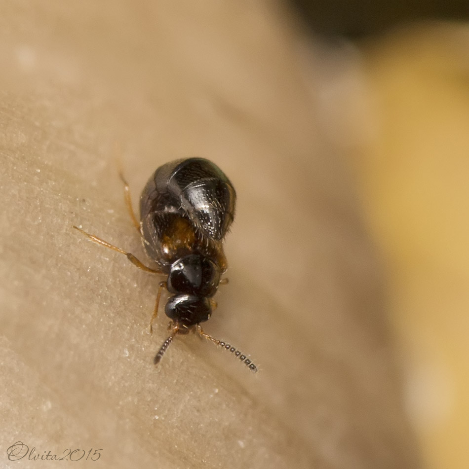 Такие вот крошки-стафиллинчики населяли колонию мелких навозников. Сначала подумала, что коллемболы - с виду и по размерам очень похожи. Но обзор в видоискатель через сотку с Рейноксом показал таких вот задирающих хвост созданий. Распрямляются, только собираясь взлетать. И как у них помещаются крылышки под такие короткие надкрылья?..