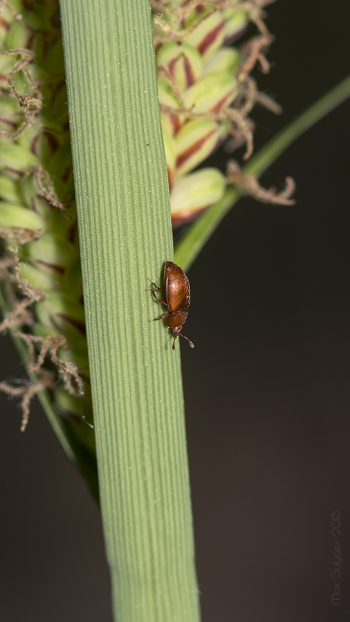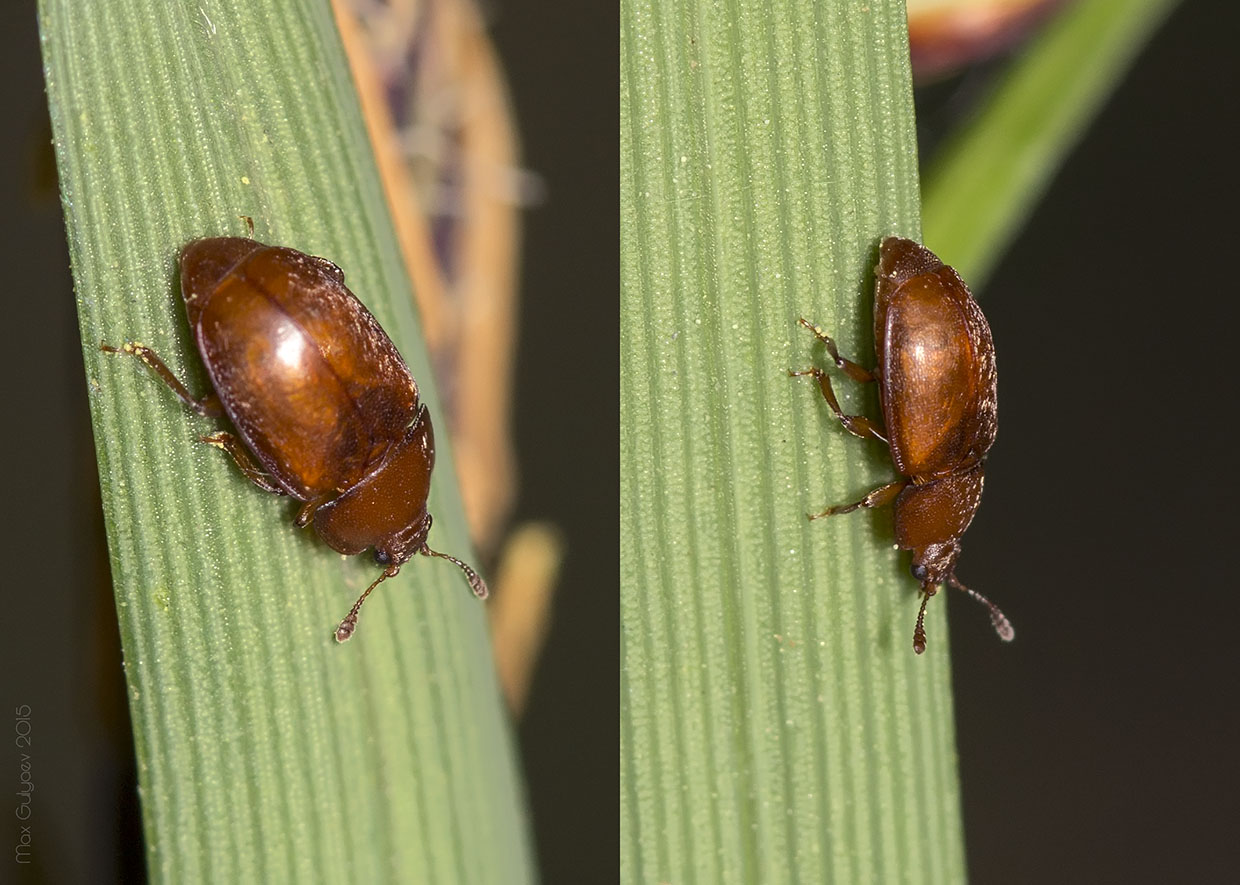 Малюсенький жучок, с определением которого пока справится не могу. То есть совсем не могу. То есть даже до семейства. То ли малинник (но пропорциями как-то не очень похож), то ли лейодида какая-то, то ли ещё кто третий...