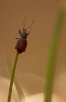 Снимала цветы, а долгоносик сам пришел, он был красно-бордового цвета, раньше таких не встречала, может, контровой свет дал такую окраску...