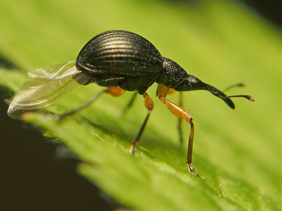 Не любят фотографироваться эти мелкие жучки (около 4-х мм длиной), явно, не любят! Слежку за собой обнаруживают моментально. Стандартная тактика-удрать, перебраться на обратную сторону листа или ветки, упасть в траву или немедленно улететь. Этот носатый почему-то не улетел, хотя и пытался расправить крылья. Выпускал и прятал их несколько раз, милостиво позволив поснимать себя немного, а затем, как обычно, внезапно свалился на землю, благополучно исчезнув из поля моего зрения.