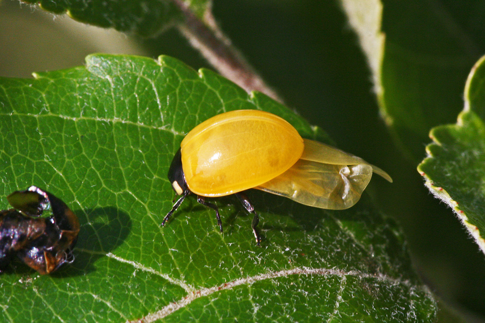 Красные,желтые, коричневые с разным количеством точек- кто их не видел.Однако за свои 76 лет сцену окрашивания(загар см в приложении) наблюдал впервые. Свеже -вылупившаяся коровка имела очень бледную окраску,затем примерно в течение часа на солнышке она набирала цвет и проявлялись точки.Может быть у кого-нибудь есть такая сцена с красными.