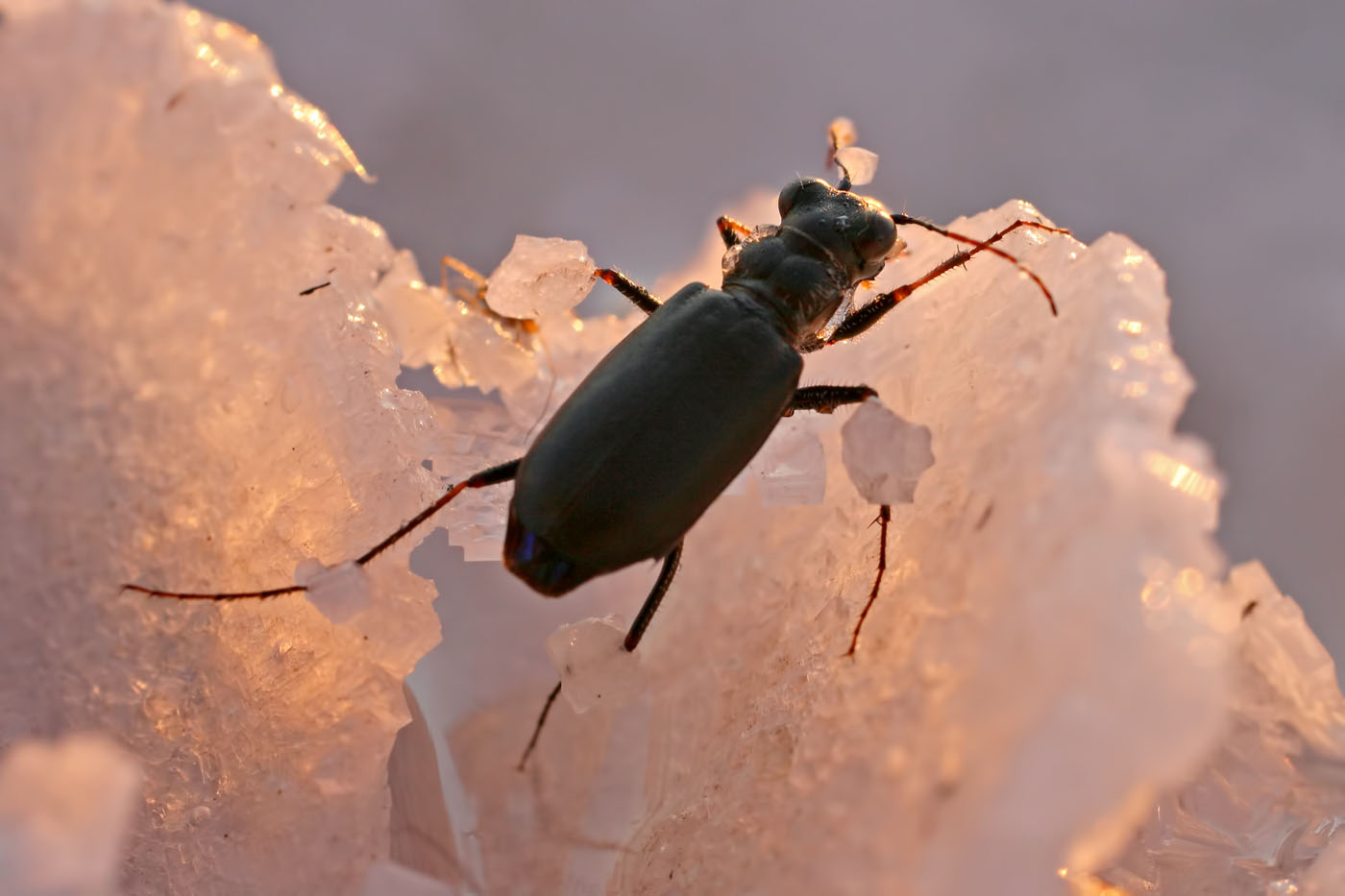Множество насекомых гибнет в рапе соленого озера Эльтон. Их трупики выносятся на берег и образуют сплошные полосы наносов. Этот скакун, меланист Cephalota atrata, так же угодил в смертельную ловушку, но еще не погиб. Тем не менее на его конечностях уже начала кристаллизоваться соль.