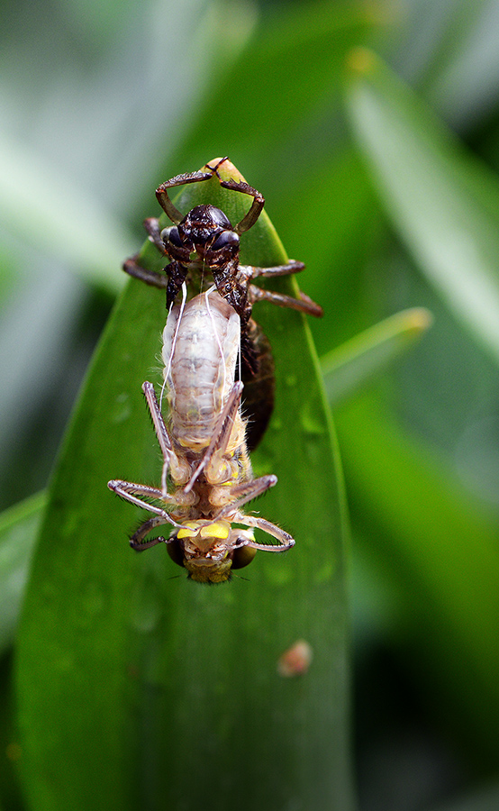 Наконец-то и мне посчастливилось поприсутствовать при рождении стрекозы. День был не самый удачный для съемок. Вначале сильная облачность, потом очень яркое солнце и ветер. Но кое-что получилось