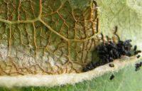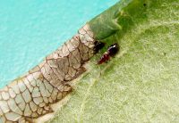 Край листа яблони небольшой ширины подвернут к нижней стороне и прикреплен паутинкой чтобы осталась полость для житья. В этом доме есть столовая,туалет и прихожая. Вот только жильца в доме не обнаружил,хотя кто-то мелкий рядом вертелся. А вместе со мной в поисках хозяина участвовал похоже очень мелкий наездник.