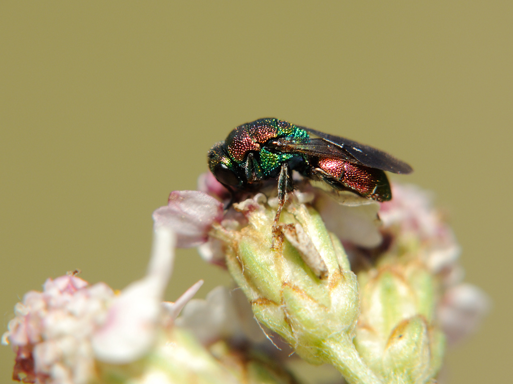 В этом году везло на ос-блестянок. Эту увидел перед приближающейся грозой. Оса прямо на глазах становилась вялой, и через некоторое время перестала двигаться совсем. Только ветер мешал фотографировать (поэтому диафрагма полностью открыта). Дождь к счастью прошёл стороной, немного только покапал. И, как только выглянуло солнышко, оса сразу же зашевелилась и улетела.