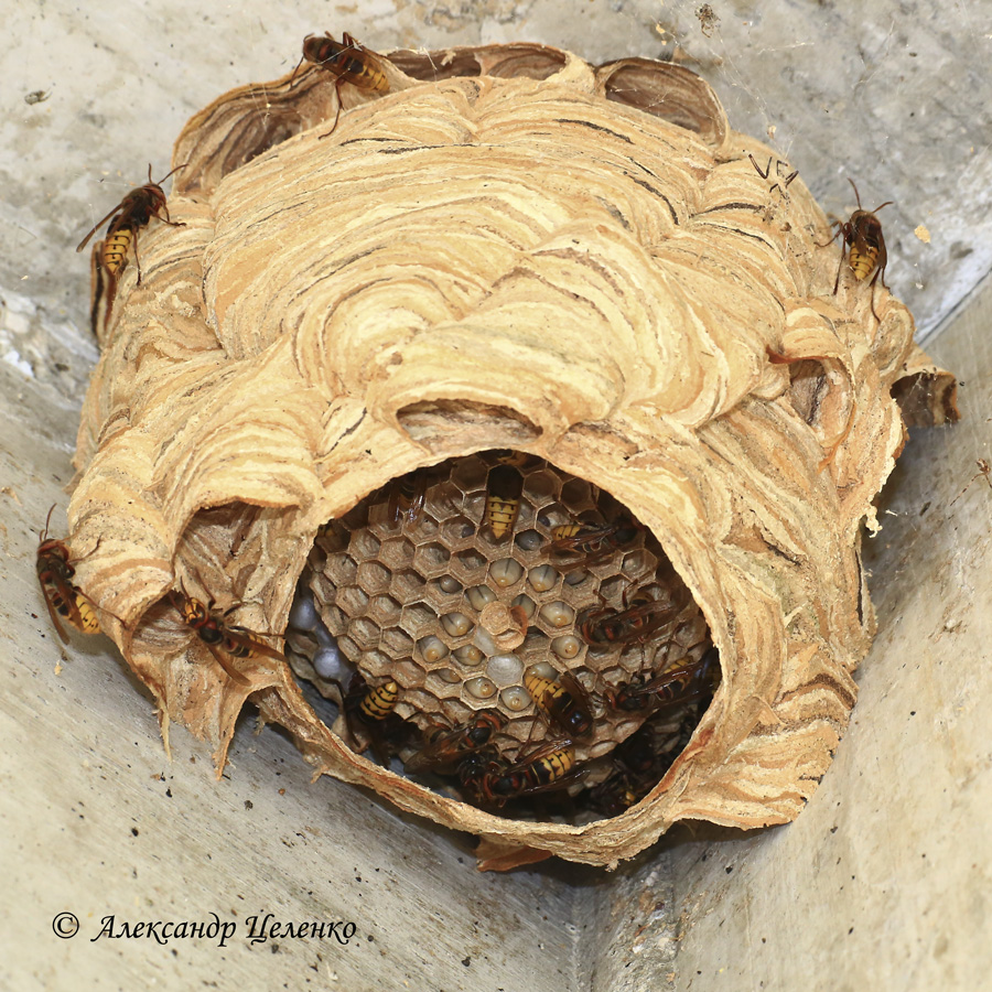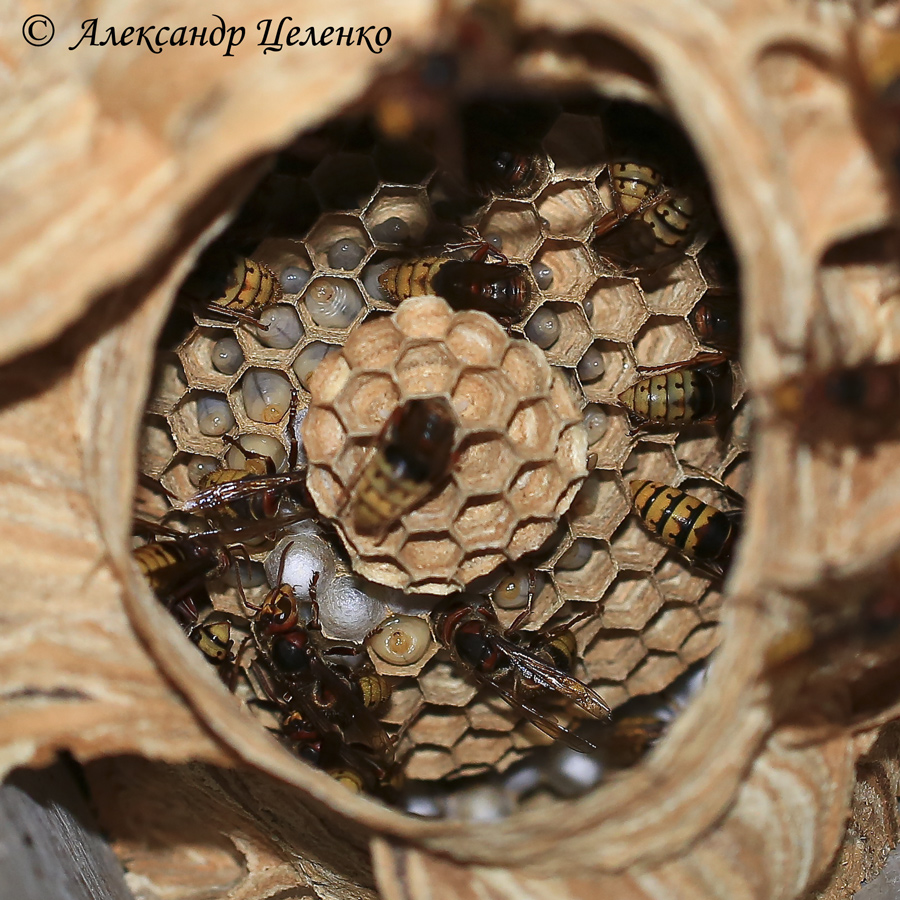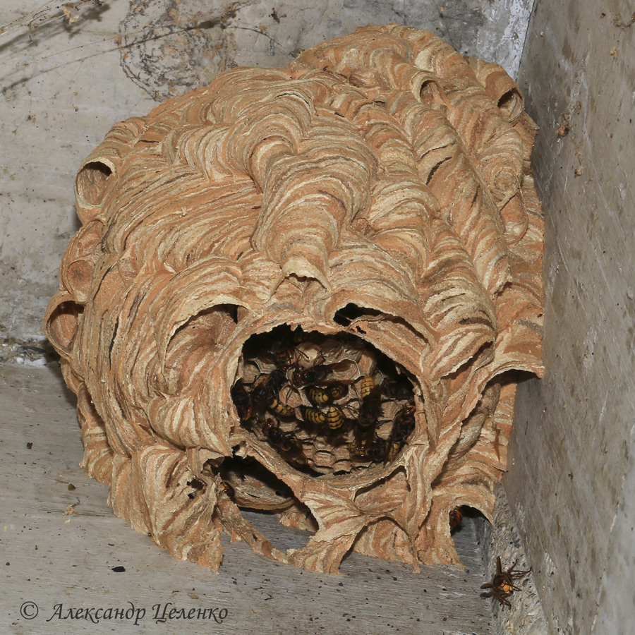 Это семейство шершней не было агрессивным хотя расстояние было до полутора метров. Видимо они привыкли к людям ведь гнездо расположено в открытой железобетонной лестнице. Гнездо разрушают каждый год поскольку опасность для взрослых и детей, имеющих алергию на укусы ос, всё-таки есть не малая, особенно когда дует крепкий ветер и насекомое может случайно залететь под одежду. Для фотографа, находящегося под гнездом, есть опасность попадания в глаза едкой жидкости, которой брызгают насекомые! Эта же едкая жидкость может повредить переднюю линзу объектива! Поэтому плотно застёгнутая одежда, фильтр для объектива и очки обязательны!