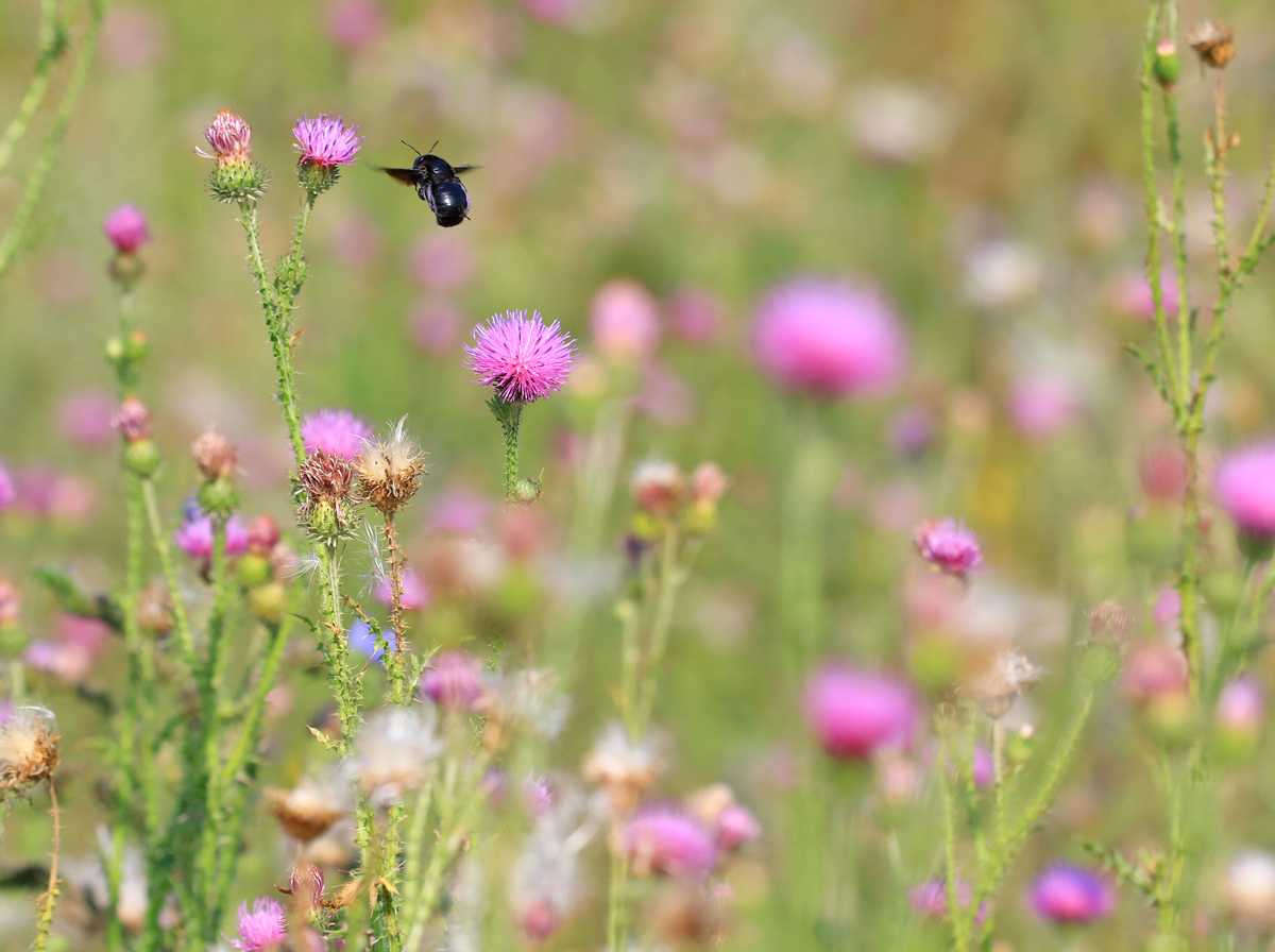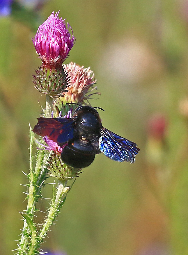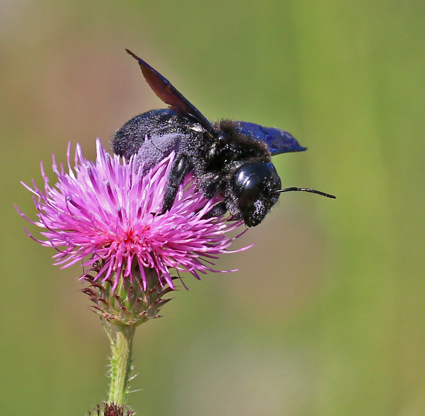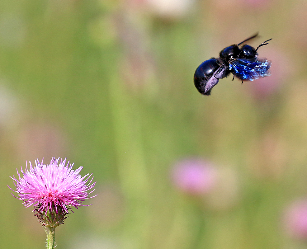 Отпуск в деревне. Красота, 30 градусов жары. Пасу овец, в шортах и с фотоаппаратом. Один из лугов плотно зарос чертополохом, никто его не ест и он прет буйным лесом по пояс высотой, там обычно полно бабочек, но лезть в колючки ? И тут явился этот перепончатокрылый. За ним! Что мчусь по колючкам поняла не сразу, они казались только непроходимыми - летает быстро, как бражник, это на таких-то маленьких крыльях - проще снять в полете, чем на цветке.