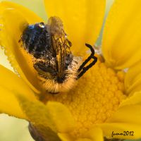 Крупнее для любознательных.Маленькая дикая пчелка спит внутри хризантемы вся в росе.