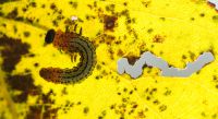 Предположу, что на снимке пилильщик тополевый точечный - Pristiphora conjugata (Dahlbom, 1835). Толковых снимков не нашел, но судя по имеющейся литературе (Атлас насекомых Украины, 1962) : "Личинка зеленая, в черных точках, три первых и два последних сегмента желтые, голова черная", весьма похоже. Раздел по пилильщикам в данном атласе писал В.Ермоленко - отличный знаток этой группы перепончатокрылых.