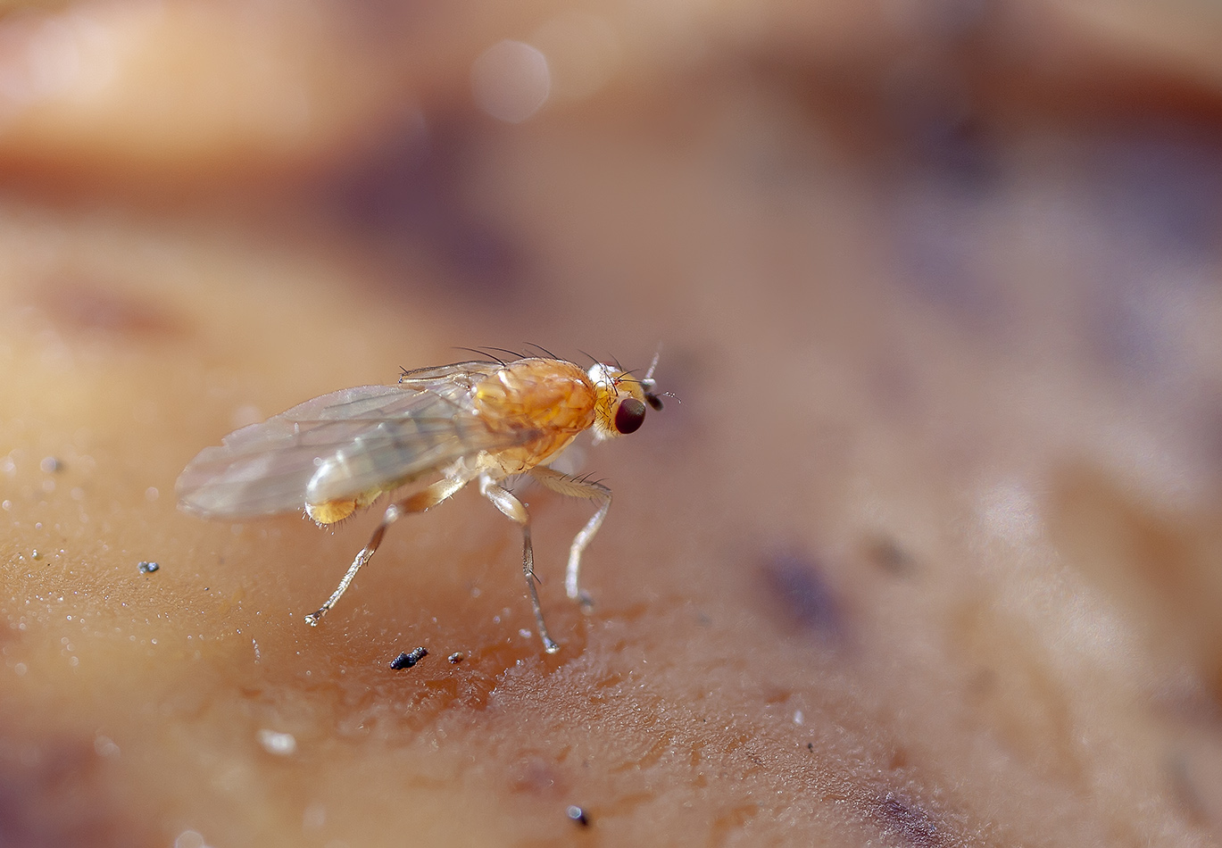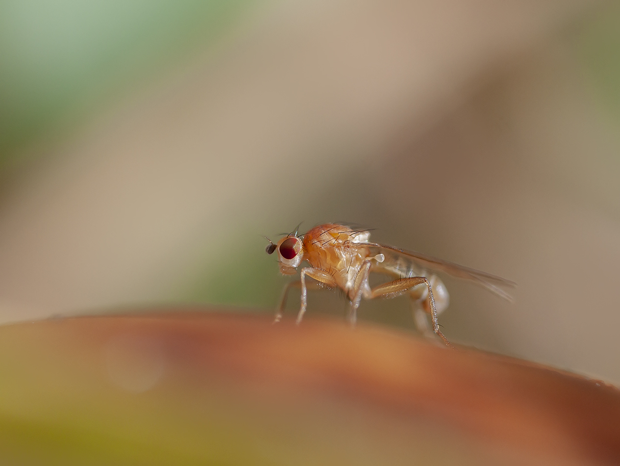 Маленькая мушка выбрала шляпку сыроежки для демонстрации себя любимой