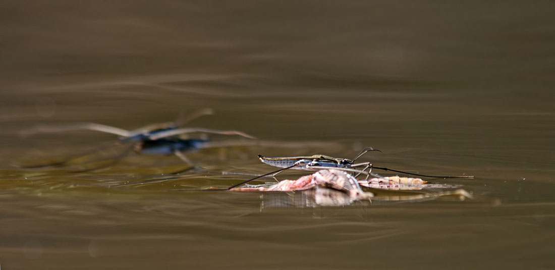 Посчастливилось найти необычайно большое скопление водомерок в одном из пойменных озер. Насекомые "кучковались" в тени прибрежных деревьев, что осложняло съемку: разница яркостей фона и переднего плана была высока. Надо что-то мудрить...