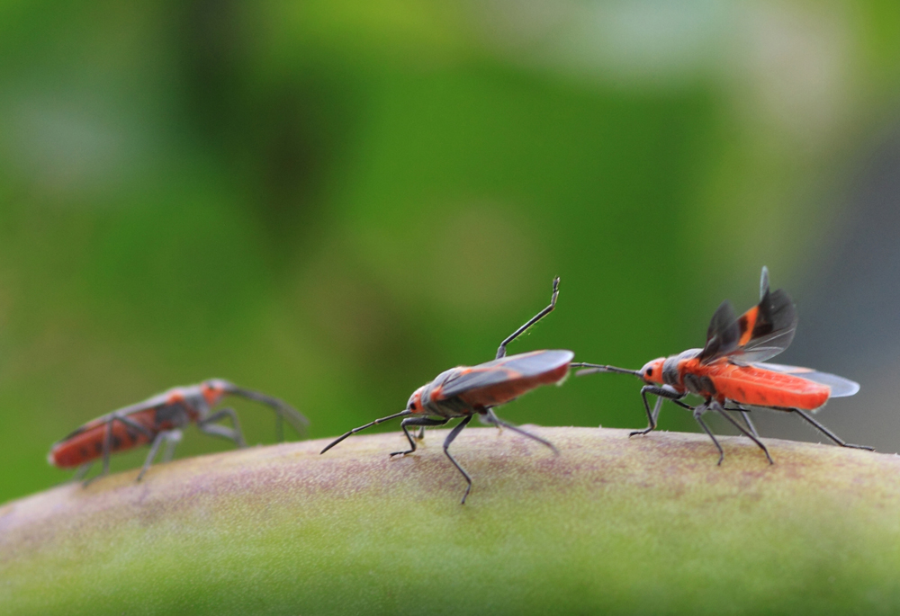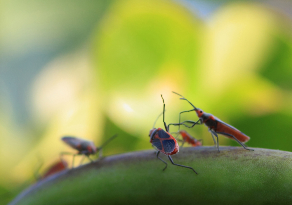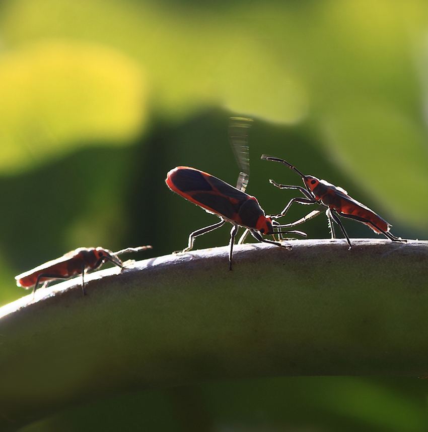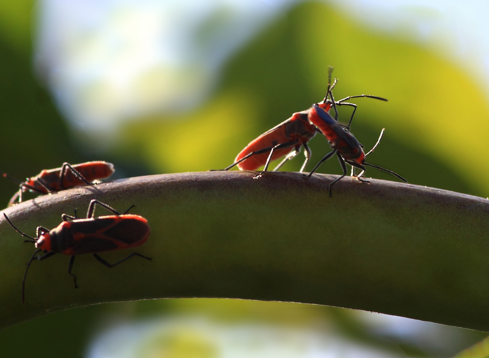 На изгороди, увитой лианами, обосновалась колония клопов – наземников . Летом их было мало, но к осени они размножились и картина стала неприглядной и совсем не «фотогеничной»: полу-объеденные листья облепленные клопами, которые вели малоподвижный образ жизни. Однако в некоторых местах этого унылого мирка обжорства, лени и гиподинамии жизнь текла совсем по другим законам! Оказалось, что среди этих клопов существует какое-то свое «воинское сословие», которое предпочитало проводить свое время в оттачивании … боевых искусств, проводя между собой поединки или групповые схватки! Единоборства представляли собой смесь фехтования, вольной борьбы, кунг-фу и еще чего-то, присущего только этим шестиногим «джедаям», в ходе которых они с удивительной ловкостью проводили захваты, наносили удары, а также отражали их, используя все свои шесть ног, двое усов и один хоботок.