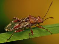 Встречал такого клопа пару раз ранее, но как-то не удавалось хорошо заснять его. А этот немного попозировал ... Похож на булавника Rhopalus maculatus.