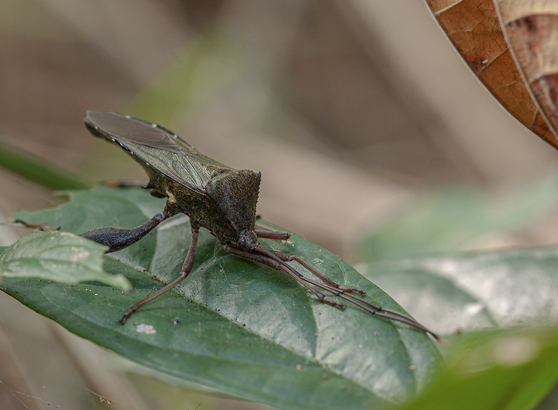 Клоп был обнаружен в густых зарослях, так что подобраться к нему было не слишком легко, Каждое мое движение вызывало сотрясение всего окружающего и можно только удивляться, что пугливый объект усидел на месте. К сожалению, и при съемке перед объективом оказалась травинка, от которой в тех условиях никак было не избавиться. Изменив ракурс я убрал травинку из кадра, но оказалось закрытым бедро клопа. Сделать третий кадр, увы, не удалось.