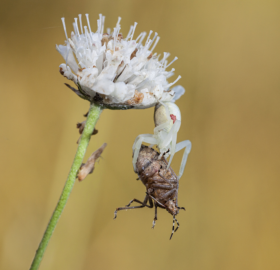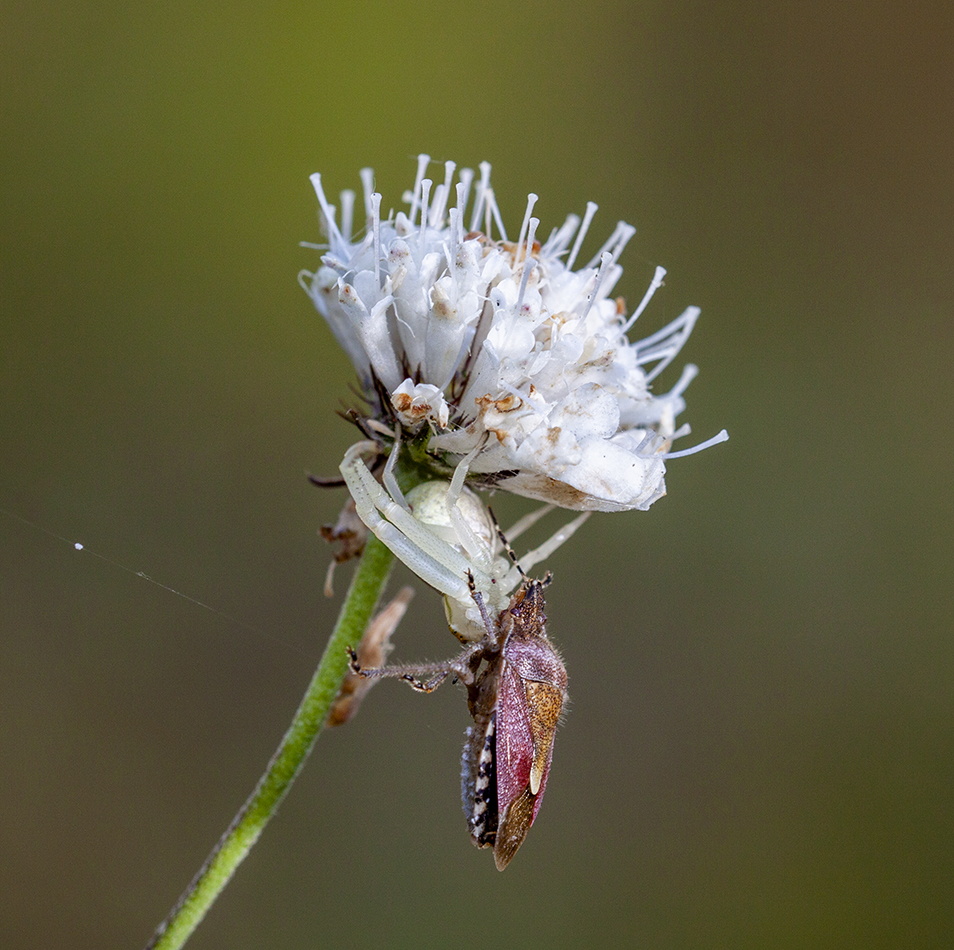 Паук мизумена, прятавшийся в цветке скабиозы, поймал и убил клопа. А теперь с удовольствием обедает.