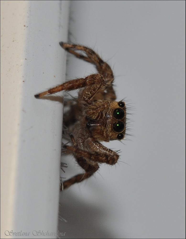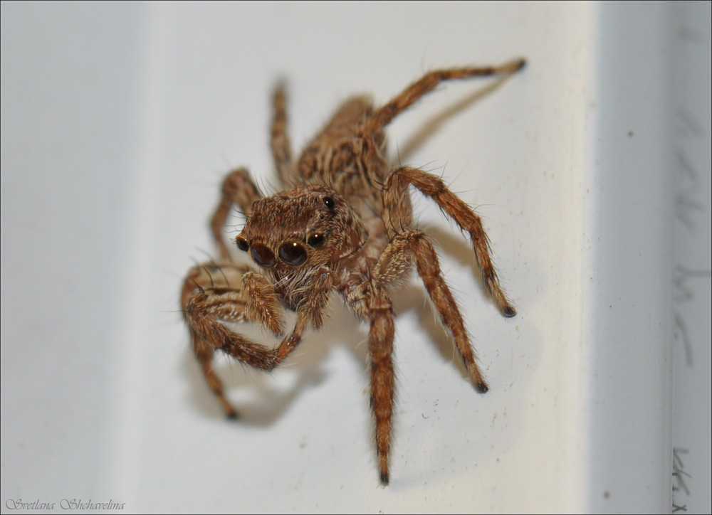 Паучок, действительно, сначала проявил любопытство к моим манипуляциям вокруг него (снимала с рук, уперевшись локтями в стену), а потом ему это все надоело и он начал чистить... то-ли ногу, то-ли ногой, этого я не поняла.