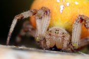 Упитанная самка аргиопы (еще и с "бутербродом" во рту) и ее щуплый кавалер. Такая вот парочка.