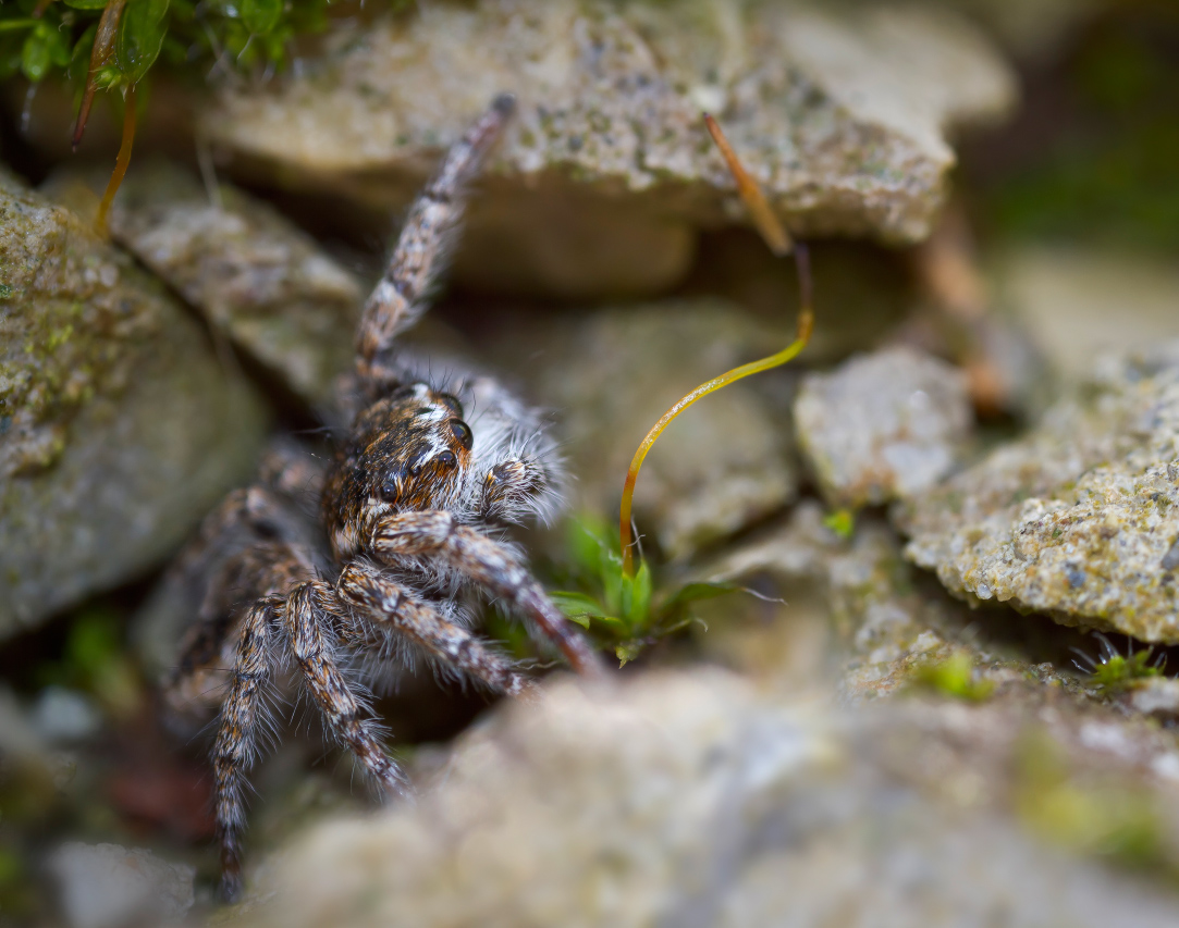 Наконец-то встретился мне паучок скакунчик и позволил сделать несколько снимков: