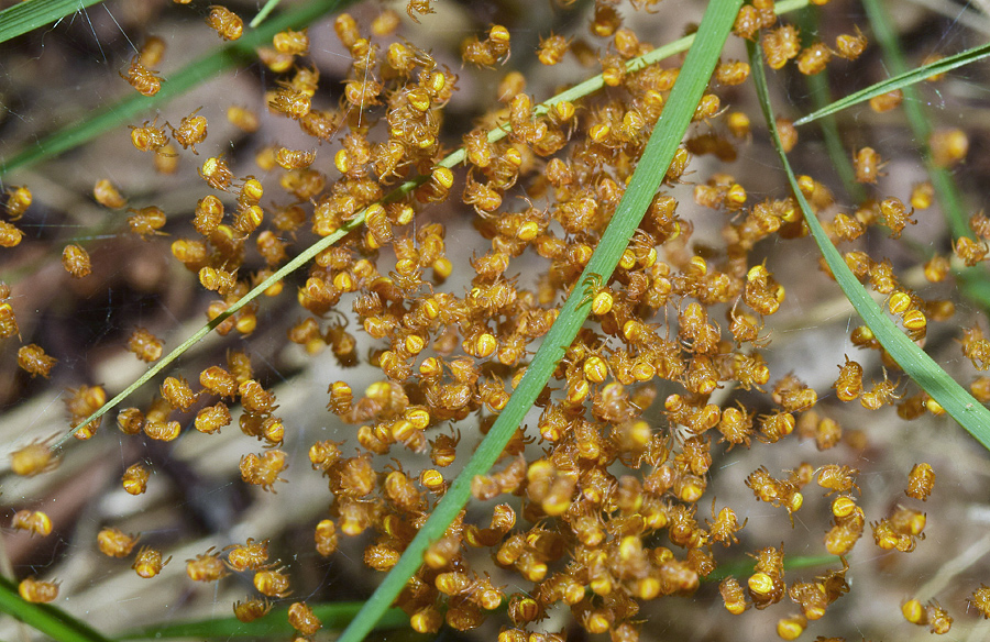 Когда увидел в траве первый раз, то подумал что раскрошенная березовая сережка в паутине. Потом еще несколько раз прошел мимо, а когда уже собирался домой, что то заставило меня установить штатив и ..... Когда на мониторе увидел эту копошащуюся кучу, то стало ясно, что тут не крошки от сережки, а целый колхоз живых организмов. Думал что пауки, но скорее всего это те клещи, которые на жуках кататься любят.Вчера еще в двух местах были