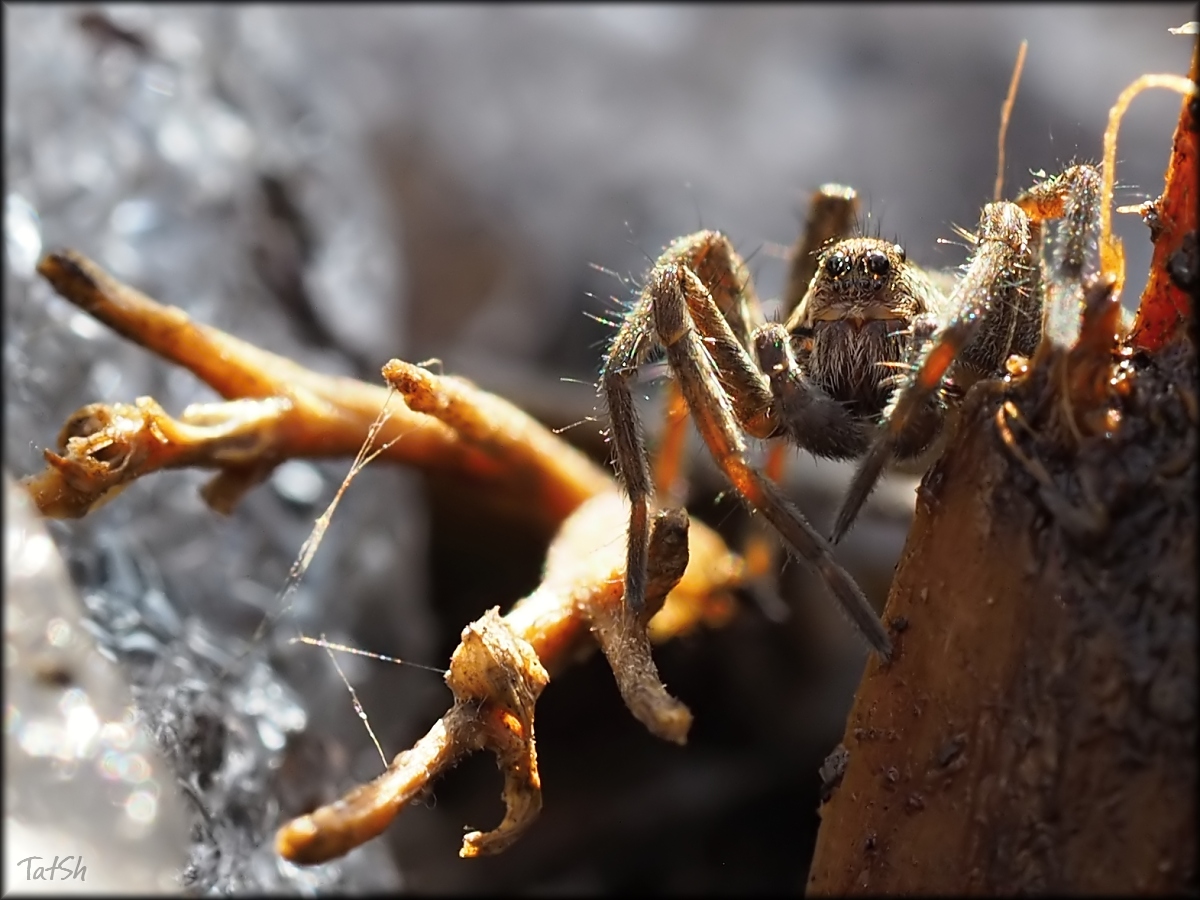 "А мне пришлось наколенники нацепить, коврик взять с крыльца и улечься перед цветником. Паук попался пугливый: выскочит из укрытия и тут же обратно или в другом местечке затаится... Но всё же дал себя поснимать... "