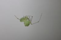 Мое внимание почему-то привлекла мелкая соринка, качавшаяся в тонкой паутинке, натянутой между ветками дерева. При взгляде сквозь окуляр фотоаппарата увидел, что это полупрозрачный зеленоватый паучок с кладкой яиц. Ветер беспрерывно раскачивал паутинку, мешая сфокусироваться, а пасмурное небо не позволяло прикрыть диафрагму и укоротить выдержку ...