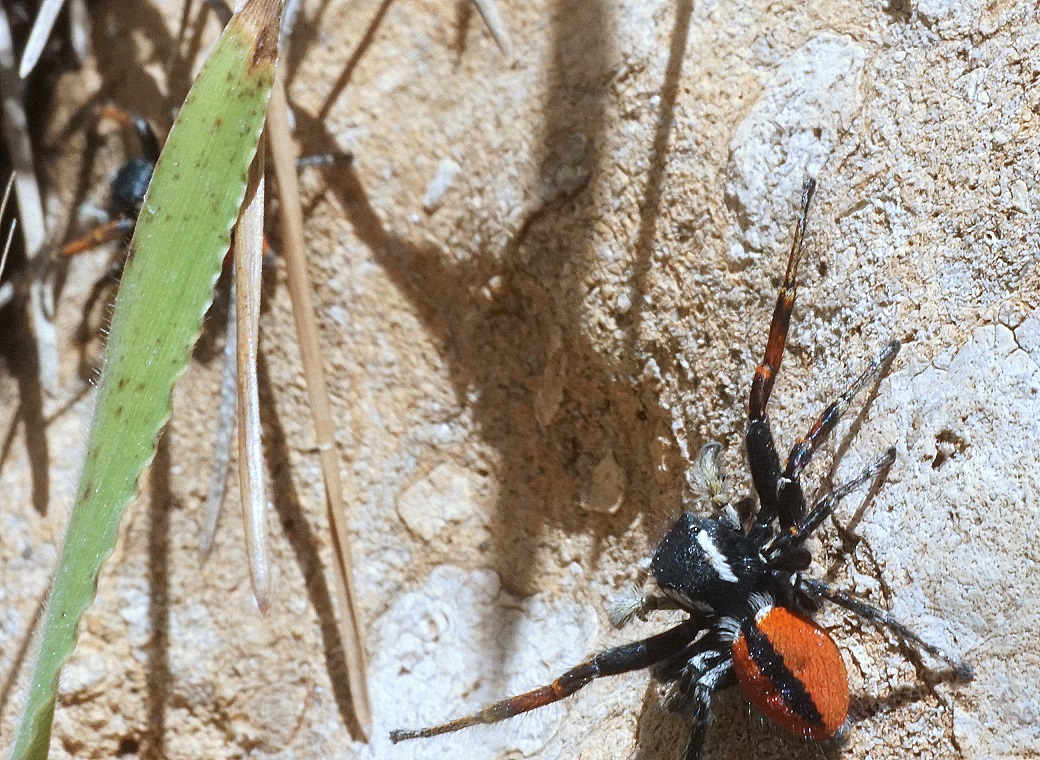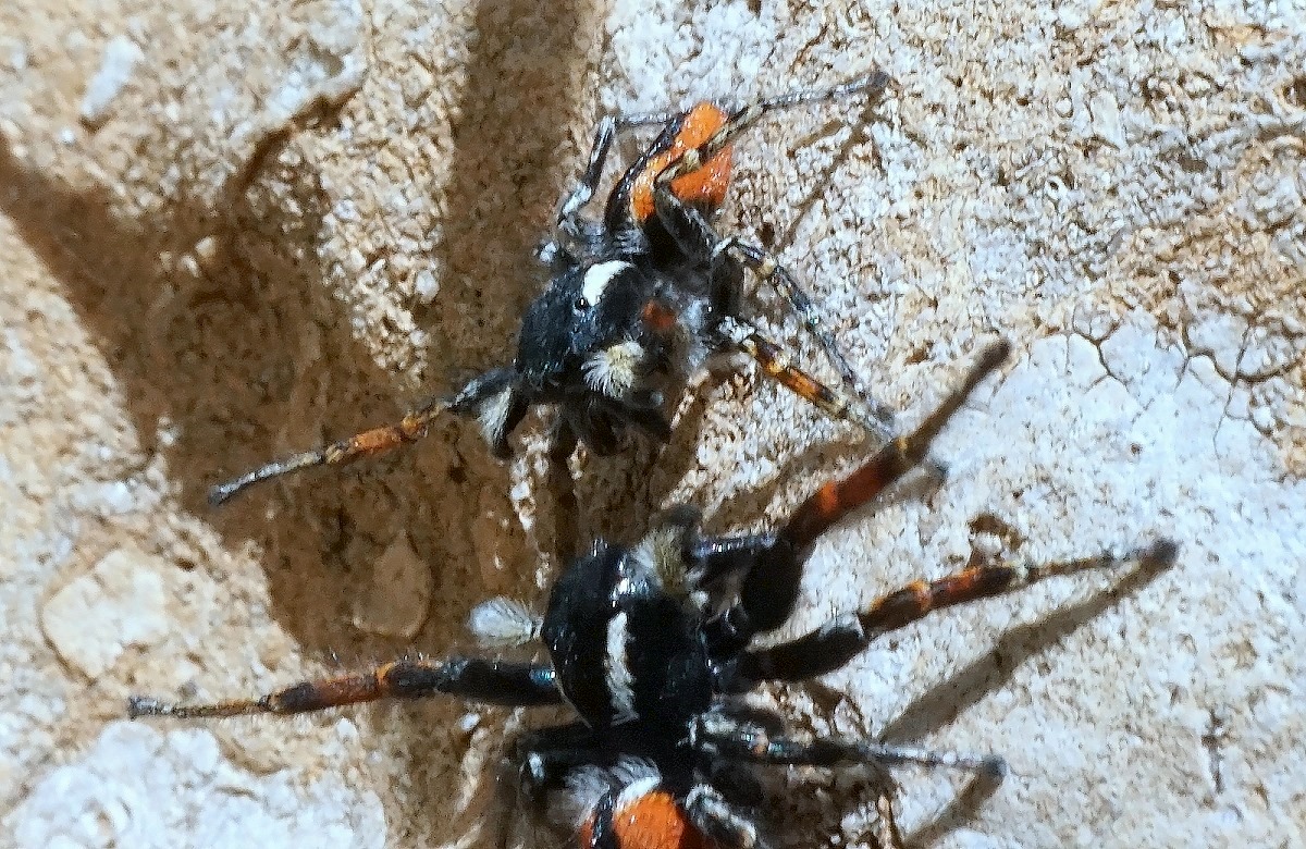 Я нарисовал следующий сюжет. Встретились два самца, которые решили выяснить - кто сильнее. Для этого они расставив передние лапки, а также педипальпы, обнажив тем самым своё оружие -хелицеры, двинулись друг на друга. Столкнувшись, второй понял, что уступает, попятился назад и вовсе удрал.