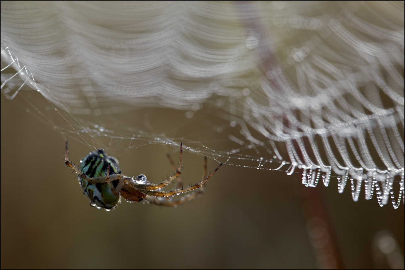 как мне кажется, со столь темным пауком в кадре исчезает равновесие, ПНУ оказывается сильно тяжелее всего остального кадра. я не говорю, что нормально проэкспонированный паук был бы к месту, скорее он бы разрушал утреннюю гармонию света в кадре, но вот если бы его удалось подсветить с обратной стороны на просвет, создав вокруг него светящийся контур и внеся легкость, имхо, было бы более выразительно. в любом случае кадр красивый а все сказанное, глубокое имхо