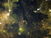 Вот таких мелкие позвоночных в мелких лужах можно весной найти. Под водой они, конечно же, эффектнее смотрятся, но в луже густая растительность из тонких зелёных водорослей (на первых фото видно), так что в том месте их по-нормальному в воде и не снять. Ещё и воду всю взмутишь пока за ними по луже ходишь. Только если нести к реке и в ней снимать. Аквариум ещё вариант, но уже не то. И вот, "постреляв" из зеркалки с объективом 55-300 (первые два кадра и с очень большим ISO - больше 1000), решил поймать хвостатого и поснимать на суше. Когда ловил, то думал, что отойду от лужи на десять метров в лес, там куча пеньков, на них мох и на нём поснимаю. Но когда поймал, и пришёл к пенькам, то никакого мха нигде не было - всё было засыпано прошлогодними листьями (был конец апреля). В общем, поснимал я рядом с лужей. Тут ещё проблема возникла при съёмке объективом 55-300. Пока притормозишь двигающегося к луже тритона, отойдёшь на пару метров на "выстрел" объектива, прицелишься, а тритон уже начал движение и вовсе не в том направлении как двигался раньше, а уже немного в сторону и от тебя. Так что мыльницей с близкого расстояния сподручнее было снимать.