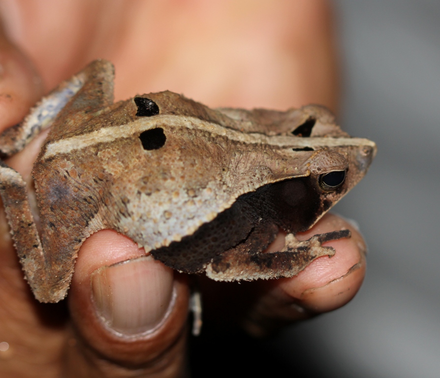 К сожалению, определить видовую принадлежность я не возьмусь. Могу сказать более-менее уверенно, что эта жабка относится к группе видов Rhinella margaritifera group. Почти все виды группы очень похожи друг на друга, и изменчивость в окраске (пятна, полосы, цвет спинной стороны тела) у каждого из них довольно широкая. Новые виды группы описываются в последние годы очень активно. Пока герпетологи разбираются, можно смириться с названием Rhinella cf. margaritifera