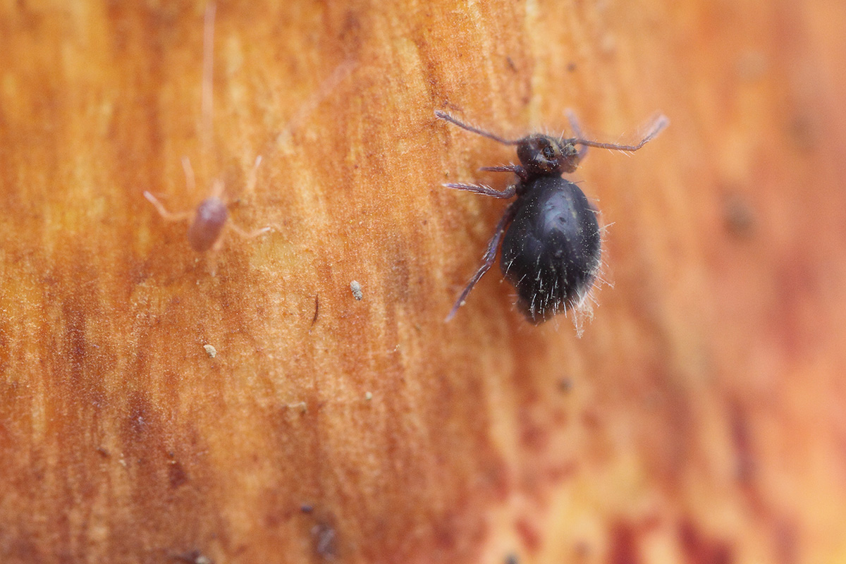 Первый (Небритый, отношу его к Sminthuridoidea) бродил по нижней поверхности гриба (моховик), все время стремился отвернуться от объектива или вовсе улизнуть из кадра. Второй (Рукастый) был невозможно стремительным, неожиданно появлялся и мгновенно исчезал из поля зрения.