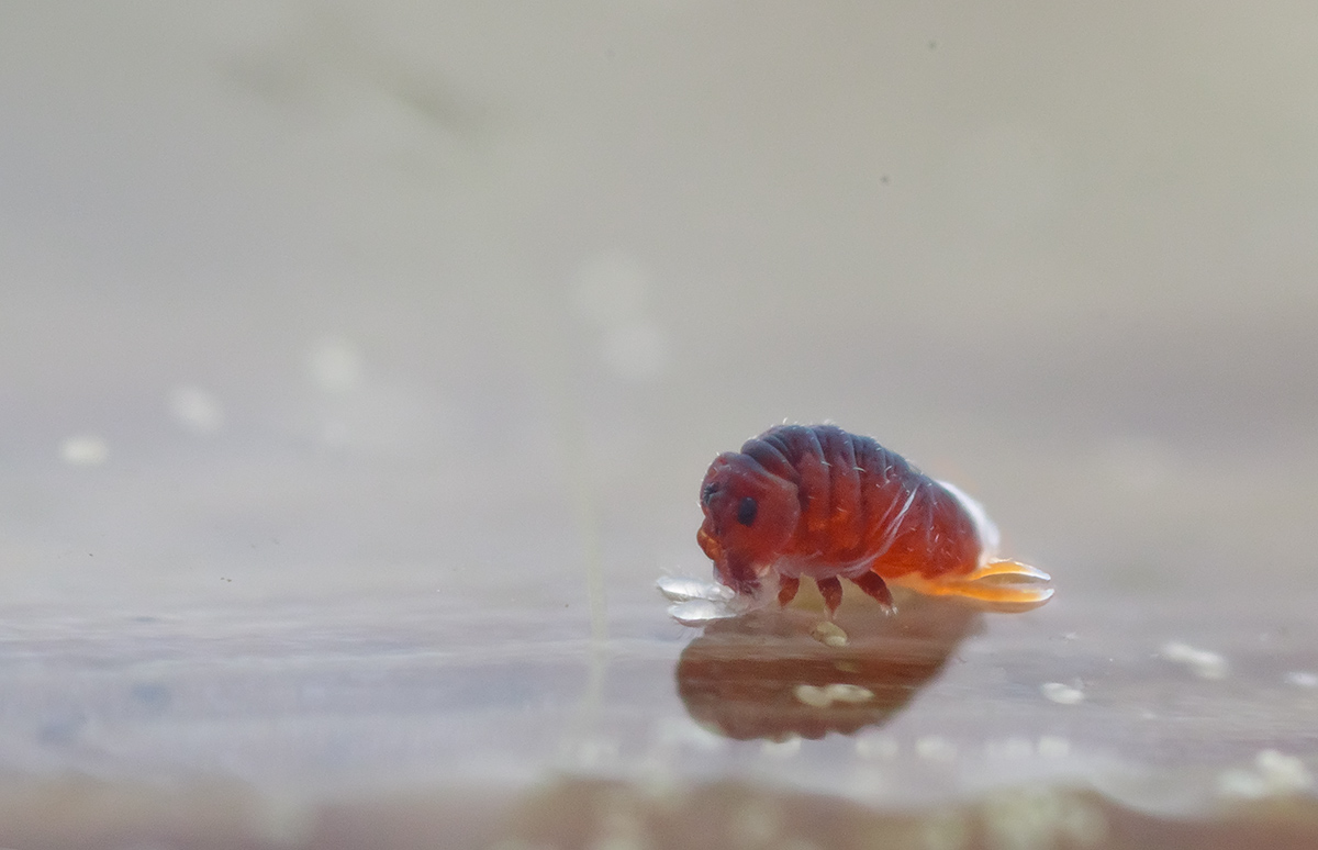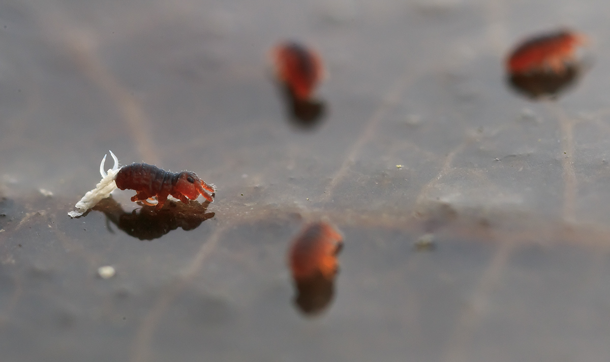 Второй год подряд наблюдаю на поверхности воды в затопленном ивняке массовую линьку коллембол. В прошлом году вода в течение недели ушла, и процесс переместился куда-то в другое место. В этом, пока вода на месте, линька продолжается уже больше двух недель. Попыталась снять подробно, как это происходит. Не все фото из одной серии. Некоторые даже с другого дня съемки, однако они отражают последовательно фазы линьки.