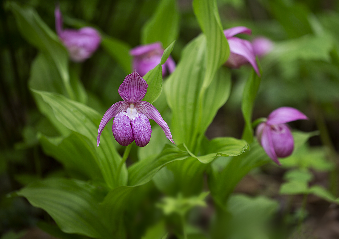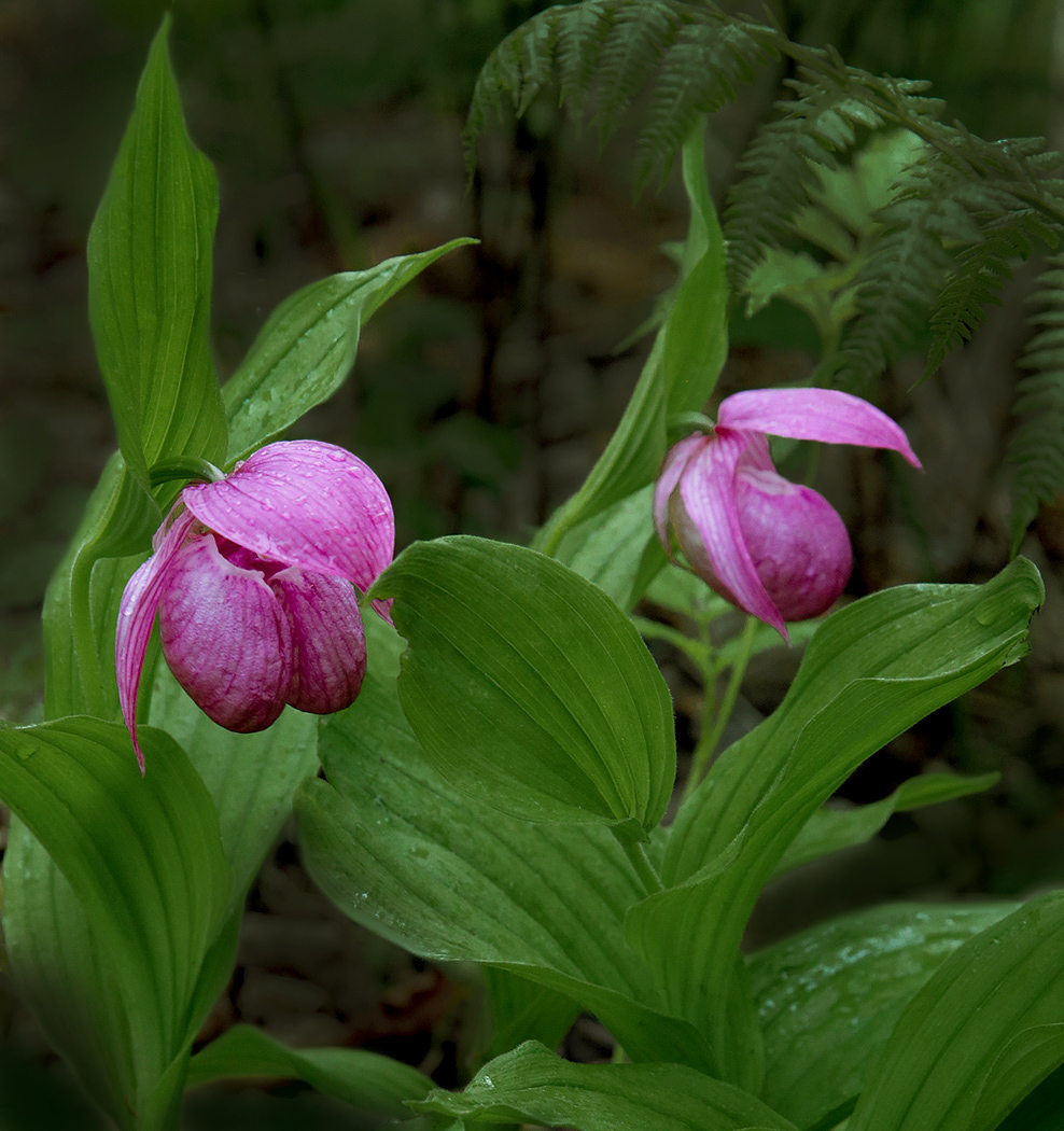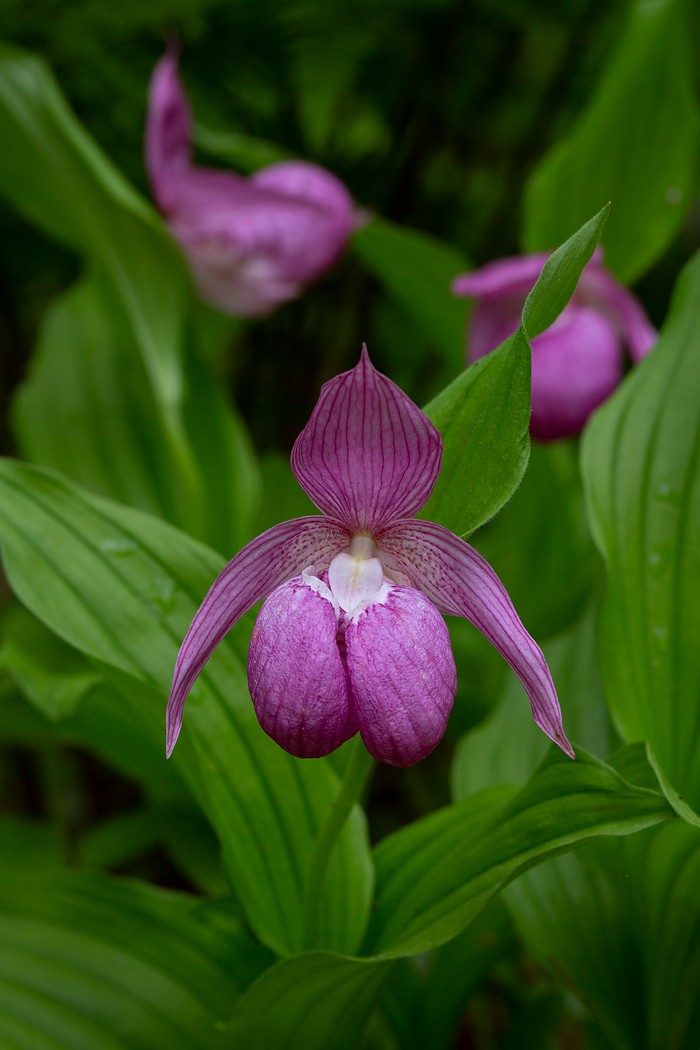 Вот уж третий сезон наблюдаю цветение этих необычных экземпляров башмачка. В позапрошлом году было одно растение, в этом уже два. И все на одной куртинке из нескольких растений. Остальные самые обычные.