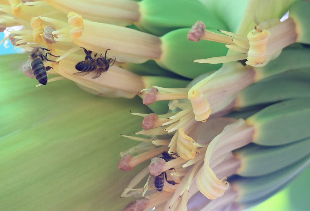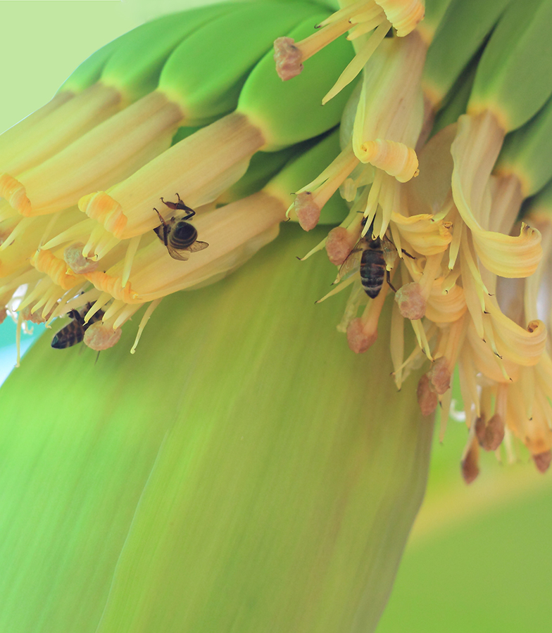 Развиваясь, банан сбрасывает старые листья, а внутри ложного ствола появляются новые побеги. Период цветения у банана наступает через 8-10 месяцев после посадки. Из-под земли через ствол прорастает цветонос, образовывающий сложное соцветие из трёх ярусов цветов: сверху находятся женские цветы, которые образуют плоды, ниже – обоеполые, а ещё ниже – мужские. Опыление происходит благодаря летучим мышам, птицам и мелким млекопитающим. Из одного соцветия обычно развивается несколько сотен бананов.