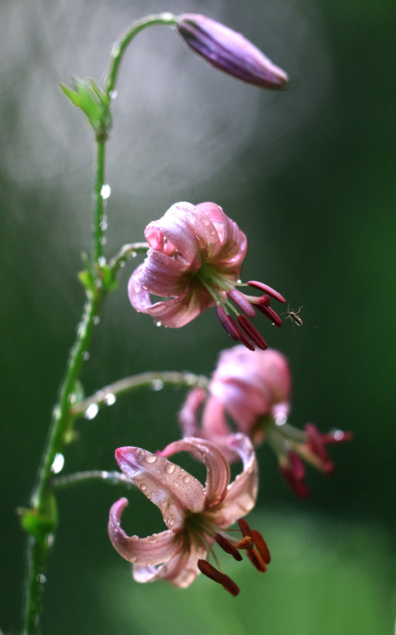 Эту саранку мы искали на узкой, заросшей папоротником просеке поначалу безуспешно, высокий орляк закрыл все. Когда возвращались по своему следу, мне попалась на глаза довольно высокая "орхидейка", ой, а шпорца у бутонов нет... Восковые светлые цветки раскрылись через неделю, мы успели как раз вовремя. В Орловском полесье мы знаем только одну точку и растений там мало. В прошлом году нашли всего один цветок, в этом - два. Комары тоже дожидались нас дружным коллективом и успели вдоволь попозировать и попировать, пока мы ползали в мокрой траве. Жаль времени было мало - нужно было вернуться в Орел до восьми утра, появились идеи, которые теперь попробую снять через год